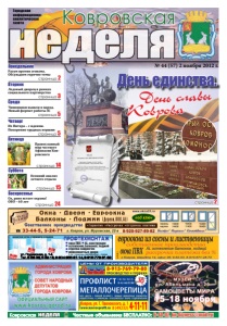 страница 24 № 44 (57) 2 ноября 2012 г. Воскресенье страница 15 Суббота страница 14 страница 3 Среда Понедельник Вторник страница 2 страница 2 Профтехмонтаж l окна ПВХ l Al-конструкции l остекление балконов, лоджий l отделка сайдингом l межкомнатные двери 5 лет гарантии • пенсионерам – скидка ул. Подлесная, д. 14. Тел. 6-68-38, 5-32-19, 8-904-955-81-14, 8-915-776-81-82 от 13500 от 13000 от 10000 реклама © КН. 2012 неделя Ковровская Частные объявления Бесплатно: 6-44-07, kn-bizness@mail.ru москитная сетка и термометр в подарок реклама ДО10 % скидки 18+ реклама Четверг страница 5 Пятница страница 5 Ковровская неделя Городская информационноаналитическая газета 15–18 ноября День единства. День славы Коврова Разум против эгоизма. Обсуждаем горячие темы Ледовый дворец в рамках социального партнерства Чиновники вышли в народ. Новый формат работы ЗС Из Питера – с идеями. Покорение трудных вершин Православный мир чествует Афанасия Ковровского Осенний анализ летнего отдыха Ох, рано встает охрана! ОВО – 60 лет