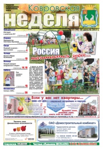 неделя 18+ Ковровская Городская информационноаналитическая газета неделя Ковровская Частные объявления БЕСПЛАТНО: 6-44-07, kn-bizness@mail.ru реклама первоначальный взнос – ÍÅÒ удобные планировки – ÄÀ дополнительные затраты – ÍÅÒ собственная котельная – ÄÀ скидки при 100% оплате – ÄÀ ипотека в любом банке – ÄÀ надежный застройщик – ÄÀ отличный район – ÄÀ ÎÎÎ «ÑÓ ÄÑÊ» – íàäåæíûé çàñòðîéùèê è ïàðòíåð Åñëè ó âàñ íåò êâàðòèðû... Äóìàéòå ñàìè, ðåøàéòå ñàìè, èìåòü èëè íå èìåòü! По вопросам приобретения квартир обращайтесь по адресу: Ковров, ул. Строителей, д. 15, стр. 1; тел. 4-72-36, 8-910-090-03-48 Проектная декларация размещена на сайте СУ ДСК: www.sudsk.ru Св-во о допуске к работам №0005.042009-3305050900-С-107 от 6.03.2012 г. 17-этажный кирпично-панельный дом на ул. Строителей, д. 29 «Березовая роща» 77% продано Плановая сдача дома – III квартал 2013 года большие кухни удобная планировка индивидуальное отопление поселок Мелехово, ул. Пионерская, д. 4 реклама © КН. 2013 Дом введен в эксплуатацию в 2011 г. От 27000 рублей за кв. м Достойная жизнь! Элитный дом Уютная квартира Вторник страница 2 страница 3 Среда Понедельник ОАО «Домостроительный комбинат» Трудоустройство для всех, кто хочет видеть свой завтрашний день благополучным и стабильным. Тел.: 9-05-38, 9-05-95, 3-91-65 E-mail: DSKOV@yandex.ru Социальные гарантии. Перспективы развития. Большой объем заказов. реклама страница 26 Воскресенье страница 15 № 33 (98) 16 августа 2013 г. страница 14 Четверг страница 4 Пятница страница 13 Суббота страницы 14, 16 8 августа на заседании Общественного совета при администрации г. Коврова обсуждали вопросы досуга детей. Присутствовавшая на заседании депутат ЗС области Галина Финашина рассказала о проекте «Для меня Россия начинается здесь», где дети в рисунках выражали то, что им ближе всего. Как оказалось, самое главное для мальчишек и девчонок – родители и двор, в котором живут. россия íà÷èíàåòñÿ çäåñü… Фото Б. Никитина Депутат ЗС Г. Финашина Кто идет в депутаты ЗС? Приоритеты Светланы Орловой Пьяный за рулем – преступник Памяти Юрия Кузнецова Новый поворот ковровского спорта Рок накрыл август Сигнал «SOS»