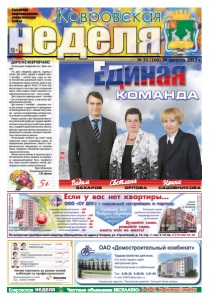неделя 18+ Ковровская Городская информационноаналитическая газета неделя Ковровская Частные объявления БЕСПЛАТНО: 6-44-07, kn-bizness@mail.ru реклама ОАО «Домостроительный комбинат» Трудоустройство для всех, кто хочет видеть свой завтрашний день благополучным и стабильным. Тел.: 9-05-38, 9-05-95, 3-91-65 E-mail: DSKOV@yandex.ru Социальные гарантии. Перспективы развития. Большой объем заказов. реклама № 35 (100) 30 августа 2013 г. страницы 2–4 êîìàíäà первоначальный взнос – ÍÅÒ удобные планировки – ÄÀ дополнительные затраты – ÍÅÒ собственная котельная – ÄÀ скидки при 100% оплате – ÄÀ ипотека в любом банке – ÄÀ надежный застройщик – ÄÀ отличный район – ÄÀ ÎÎÎ «ÑÓ ÄÑÊ» – íàäåæíûé çàñòðîéùèê è ïàðòíåð Åñëè ó âàñ íåò êâàðòèðû... Äóìàéòå ñàìè, ðåøàéòå ñàìè, èìåòü èëè íå èìåòü! По вопросам приобретения квартир обращайтесь по адресу: Ковров, ул. Строителей, д. 15, стр. 1; тел. 4-72-36, 8-910-090-03-48 Проектная декларация размещена на сайте СУ ДСК: www.sudsk.ru Св-во о допуске к работам №0005.042009-3305050900-С-107 от 6.03.2012 г. 17-этажный кирпично-панельный дом на ул. Строителей, д. 29 «Березовая роща» 77% продано Плановая сдача дома – III квартал 2013 года большие кухни удобная планировка индивидуальное отопление поселок Мелехово, ул. Пионерская, д. 4 реклама © КН. 2013 Дом введен в эксплуатацию в 2011 г. От 27000 рублей за кв. м Достойная жизнь! Элитный дом Уютная квартира Вадим ÇÀÕÀÐÎÂ ÎÐËÎÂÀ Светлана Ирина ÑÀÄÎÂÍÈÊÎÂÀ 5+ Дорогие ковровчане! От всей души поздравляю вас с Днем знаний! Это день ожиданий, радости, надежд и хлопот. Для ребят, идущих в первый класс, 1 сентября – особый день, когда на смену беззаботной дошкольной поре в их жизни появляются первые учителя, уроки и первые школьные друзья. Более 14 тысяч первоклассников в этом году сядут за школьные парты, чтобы открыть новую страничку в самой увлекательной из книг – книге знаний. Для студентов-первокурсников 1 сентября – шаг во взрослую жизнь, в мир новых профессиональных знаний. Для учителя 1 сентября – отправная точка для выхода в привычный и одновременно неизведанный путь с новыми попутчиками – детьми и их родителями, которые только вступили на длинную дорогу знаний. Немало сделано и для повышения престижа учительской профессии: средняя заработная плата педагогического работника сравнялась со средней заработной платой в области, работают адресные целевые программы, направленные на помощь молодым специалистам, обеспечение их жильем. Наступающий учебный год ставит перед педагогами новые масштабные задачи по модернизации дошкольного, общего и профессионального образования, по освоению новых стандартов, обновлению программ и технологий обучения. Желаю вам настойчиво и творчески идти к поставленным целям, опираясь на поддержку единомышленников! Пусть покоряются вам самые высокие вершины знаний, претворяются в жизнь смелые начинания! Врио губернатора Владимирской области с.Ю. орлова