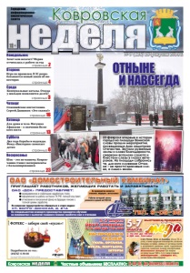 неделя 18+ Ковровская Городская информационноаналитическая газета неделя Ковровская Частные объявления БЕСПЛАТНО: 6-44-07, kn-bizness@mail.ru Понедельник ÎÀÎ «ÄÑÊ» ïðåäîñòàâëÿåò:  своевременную и стабильную заработную плату;  оформление на работу согласно ТК РФ, полный соц.пакет;  отчисления в пенсионный фонд на будущую пенсию с полной суммы заработка. ÎÀÎ «Äîìîñòðîèòåëüíûé êîìáèíàò» ïðèãëàøàåò ðàáîòíèêîâ, æåëàþùèõ ðàáîòàòü è çàðàáàòûâàòü Òåë. 9-05-35 Ïî âîïðîñàì òðóäîóñòðîéñòâà îáðàùàòüñÿ â îòäåë êàäðîâ: óë. Âîëãî-Äîíñêàÿ, ä. 21à Ïî ñïåöèàëüíîñòÿì îñíîâíîãî ïðîèçâîäñòâà ïðîâîäèòñÿ îáó÷åíèå íà ïðåäïðèÿòèè ñ âûïëàòîé ó÷àùèìñÿ ïîìèìî çàðàáîòêà åùå è ñòèïåíäèè реклама Рàáî÷èå âå÷åðíåé ñìåíû ðàçâîçÿòñÿ äîìîé àâòîáóñîì Нà ïðåäïðèÿòèè èìåþòñÿ ñòîëîâàÿ, ìåäïóíêò, àâòîñòîÿíêà № 9 (126) 28 февраля 2014 г. страница 4 Среда Вторник страница 2 Четверг страница 3 Пятница страница 16 реклама выставка-продажа с юга России, Алтая, из Башкирии (более 20 сортов), а также продукция пчеловодства, алтайские бальзамы на травах, живица от суставных болей, в ассортименте домашние масла: подсолнечное, горчичное, тыквенное, льняное, расторопшевое. Внимание! Акция! При покупке на сумму свыше 1500 р. 0,5 кг меда в подарок. ЖЕНЩИНАМ – СКИДКА 5%. личная пасека семьи Доценко ìåäà с 10.00 до 19.00 в ДК им. Ногина МАРТА 5-7 реклама 6-7 марта ДКиТ «Родина» С 9.00 до 19.00 Производство г. Пятигорск РАСПРОДАЖА ТКАНЕЙ: ТЮЛЬ, ОРГАНЗА, ВУАЛЬ, ПОРТЬЕРА, ШТОРЫ по 100 руб. за 1 м реклама ОТНЫНЕ И НАВСЕГДА страница 23 23 февраля впервые в истории города на площади Воинской славы прошли мероприятия, посвященные Дню защитника Отечества. Звучали ружейные залпы и слова благодарности, сверкали всполохи салюта и блестели слезы в глазах ветеранов. На площади собрались те, для кого служение Отчизне – не просто красивые слова, а смысл жизни. 3 Суббота страница 13 Воскресенье страница 6 Зачет или незачет? Мэрия отчиталась о работе за год Шок – это по-нашему. Ковровчанин ставил эксперименты с бальзамированием Два года борьбы и надежды. Фонд «Виктория» помогает детям Для души и тела. Матушка Афанасия – о значении Великого поста Олимпийские впечатления. Сергей Дышаков: «Это сказка!» Коммунальные каталы. Откуда у жильцов появляются долги? Игра по правилам. В ЗС разрабатывается новый закон об инвесторах