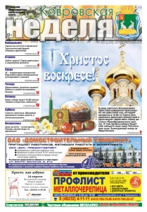 неделя Ковровская Частные объявления БЕСПЛАТНО: 6-44-07, kn-bizness@mail.ru Понедельник ÎÀÎ «ÄÑÊ» ïðåäîñòàâëÿåò: своевременную и стабильную заработную плату; оформление на работу согласно ТК РÔ, полный соц.пакет; отчисления в пенсионный фонд на будущую пенсию с полной суммы заработка. ÎÀÎ «Äîìîñòðîèòåëüíûé êîìáèíàò» ïðèãëàøàåò ðàáîòíèêîâ, æåëàþùèõ ðàáîòàòü è çàðàáàòûâàòü Òåë. 9-05-35 По âопросаì трóäоóстроéстâа оáраùатüсÿ â отäåл каäроâ: óë. Âîëãî-Äîíñêàÿ, ä. 21à По спåöиалüностÿì осноâноãо проиçâоäстâа проâоäитсÿ оáó÷åниå на прåäприÿтии с âûплатоé ó÷аùиìсÿ поìиìо çараáотка åùå и стипåнäии реклама Раáо÷иå âå÷åрнåé сìåнû раçâоçÿтсÿ äоìоé аâтоáóсоì На прåäприÿтии иìåþтсÿ столоâаÿ, ìåäпóнкт, аâтостоÿнка № 16 (133) 18 апреля 2014 г. страница 4 Среда Вторник страница 2 Четверг страница 2 Пятница страница 14 24 апреля реклама от производителя МЕТАЛЛОЧЕРЕПИЦА ПРОФЛИСТ С-8, С-10, С-18, С-21, НС-45, Н-60, ПЛОСКИЙ ЛИСТ реклама ● ВСЕ ЦВЕТА ● ЛЮБОЙ РАЗМЕР ● ДОБОРНЫЕ ЭЛЕМЕНТЫ БЕЗ ВЫХОДНЫХ с 9.00 до 19.00 www.metallprofil33.ru ул. Т. Павловского, 1 8 (49232) 4-11-11 8-915-769-79-80 8-915-760-22-07 Õðèñòîñ âîñêðåñå! неделя 12+ Ковровская Городская информационноаналитическая газета В день светлого Воскресения Христова ковровчан приглашают на крестный ход, который начнется в 16.00 от Свято-Знаменского женского монастыря и проследует через весь город до Спасо-Преображенского храма. А там православных будет уже ожидать еще одно Пасхальное чудо: Благодатный огонь из Иерусалима. страница 3 Воскресенье страница 23 страница 11 Суббота страница 13 Город-сад остался в прошлом? Экологический форум обнажил проблемы Дайте дорогу! Город приступил к дорожному ремонту ЗС – территория контрастов. Парламентарии обнародовали декларации о доходах Фронтовики, наденьте ордена! Война и служба полковника Исаева Кино теперь будет! В ДК имени Ленина открылись кинозалы Совесть замучила. Женщина присвоила чужие деньги, а потом раскаялась День да ночь – сутки прочь. Нужны ли нам игры со временем?