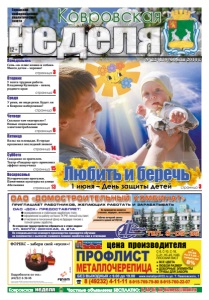 неделя Ковровская Частные объявления БЕСПЛАТНО: 6-44-07, kn-bizness@mail.ru Понедельник ÎÀÎ «ÄÑÊ» ïðåäîñòàâëÿåò:  своевременную и стабильную заработную плату;  оформление на работу согласно ТК РФ, полный соц.пакет;  отчисления в пенсионный фонд на будущую пенсию с полной суммы заработка. ÎÀÎ «Äîìîñòðîèòåëüíûé êîìáèíàò» ïðèãëàøàåò ðàáîòíèêîâ, æåëàþùèõ ðàáîòàòü è çàðàáàòûâàòü Òåë. 9-05-35 Ïî âîïðîñàì òðóäîóñòðîéñòâà îáðàùàòüñÿ â îòäåë êàäðîâ: óë. Âîëãî-Äîíñêàÿ, ä. 21à Ïî ñïåöèàëüíîñòÿì îñíîâíîãî ïðîèçâîäñòâà ïðîâîäèòñÿ îáó÷åíèå íà ïðåäïðèÿòèè ñ âûïëàòîé ó÷àùèìñÿ ïîìèìî çàðàáîòêà åùå è ñòèïåíäèè реклама Ðàáî÷èå âå÷åðíåé ñìåíû ðàçâîçÿòñÿ äîìîé àâòîáóñîì Íà ïðåäïðèÿòèè èìåþòñÿ ñòîëîâàÿ, ìåäïóíêò, àâòîñòîÿíêà № 22 (139) 30 мая 2014 г. страница 4 Среда Вторник страница 3 Четверг страница 6 Пятница страница 6 реклама цена производителя МЕТАЛЛОЧЕРЕПИЦА ПРОФЛИСТ С-8, С-10, С-18, С-21, НС-45, Н-60, ПЛОСКИЙ ЛИСТ с 20.04 по 31.05 – скидка до 8% реклама ● ВСЕ ЦВЕТА ● ЛЮБОЙ РАЗМЕР ● ДОБОРНЫЕ ЭЛЕМЕНТЫ ● ТРУБЫ ДЛЯ ЗАБОРА БЕЗ ВЫХОДНЫХ с 9.00 до 19.00 www.metallprofil33.ru ул. Т. Павловского, 1 8 (49232) 4-11-11 8-915-769-79-80 8-915-760-22-07 неделя 12+ Ковровская Городская информационноаналитическая газета Суббота страница 14 страница 13 страница 3 Любить и беречь 1 июня – День защиты детей Воскресенье страница 15 Семь «я» плюс кошка и собака. Много деток – хорошо! У поэта трудная работа. Владимир Кузнецов – певец родного края У реки, не видя реки. Будет ли в Коврове набережная? Сколько там «нагорело»? Новые социальные нормы электопотребления Вальс на площади. В городе прозвенел последний звонок Свидание со зрителем. Театр «Рандеву-арт» применил эффект попутчика Исторические прогулки. Памятники культуры на улице Абельмана