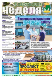 неделя 12+ Ковровская Городская информационноаналитическая газета неделя Ковровская Частные объявления БЕСПЛАТНО: 6-44-07, kn-bizness@mail.ru Понедельник ÎÀÎ «ÄÑÊ» ïðåäîñòàâëÿåò: ñâîåâðåìåííóþ è ñòàáèëüíóþ çàðàáîòíóþ ïëàòó; îôîðìëåíèå íà ðàáîòó ñîãëàñíî ÒÊ ÐÔ, ïîëíûé ñîö.ïàêåò; îò÷èñëåíèÿ â ïåíñèîííûé ôîíä íà áóäóùóþ ïåíñèþ ñ ïîëíîé ñóììû çàðàáîòêà. ÎÀÎ «Äîìîñòðîèòåëüíûé êîìáèíàò» ïðèãëàøàåò ðàáîòíèêîâ, æåëàþùèõ ðàáîòàòü è çàðàáàòûâàòü Òåë. 9-05-35 Ïî âîïðîñàì òðóäîóñòðîéñòâà îáðàùàòüñÿ â îòäåë êàäðîâ: óë. Âîëãî-Äîíñêàÿ, ä. 21à Ïî ñïåöèàëüíîñòÿì îñíîâíîãî ïðîèçâîäñòâà ïðîâîäèòñÿ îáó÷åíèå íà ïðåäïðèÿòèè ñ âûïëàòîé ó÷àùèìñÿ ïîìèìî çàðàáîòêà åùå è ñòèïåíäèè ðåêëàìà Ðàáî÷èå âå÷åðíåé ñìåíû ðàçâîçÿòñÿ äîìîé àâòîáóñîì Íà ïðåäïðèÿòèè èìåþòñÿ ñòîëîâàÿ, ìåäïóíêò, àâòîñòîÿíêà № 28 (145) 11 июля 2014 г. страница 4 Среда Вторник страница 3 Четверг страница 4 Пятница страница 13 ЦЕНА – СУПЕР! 408 рублей МЕТАЛЛОЧЕРЕПИЦА ПРОФЛИСТ С-8, С-10, С-18, С-21, НС-45, Н-60, ПЛОСКИЙ ЛИСТ акция на лист RAL крашеный 2 м с 10.07 по 15.08 реклама ● ВСЕ ЦВЕТА ● ЛЮБОЙ РАЗМЕР ● ДОБОРНЫЕ ЭЛЕМЕНТЫ ● ТРУБЫ ДЛЯ ЗАБОРА БЕЗ ВЫХОДНЫХ с 9.00 до 19.00 www.metallprofil33.ru ул. Т. Павловского, 1 8 (49232) 4-11-11 8-915-769-79-80 8-915-760-22-07 ðåêëàìà ÑÐÎ×ÍÎ! Ñåðòèôèêàòû íà ñîîòâåòñòâèå ÃÎÑÒ è Åâðîïåéñêîé íîðìå EN-1176 Îñòàëîñü 52 äíåé! – äåòñêèå ïëîùàäêè – ñïîðòèâíûå êîìïëåêñû – ïëîùàäêè ÃÒÎ, ÍÂÏ Ïîäðîáíîñòè ïî òåë.: 8 (49232) 44-900; 8 (915) 79-30-30-6 e-mail: antey_33@mail.ru; play.antey33.ru ООО «ТПК «АНТЕЙ» д о рОе та лпирзоаецкитиа Суббота страница 14 Воскресенье страница 15 страница 14 страница 6 Будет работа – вернется то, что было грубо отнято: стабильность, вера в свое будущее, а главное – вера в будущее детей. Одной из первых на призыв о помощи откликнулась компания «Аскона». На ее многоплановом производстве найдется работа специалистам различных профессий, с любым уровнем подготовки. Украинским беженцам уже сейчас предложили 50 вакансий. Беженцам предлагают работу Открытая власть. Как создать доступную среду для особенных людей За верность и за любовь! Парам-юбилярам – слова уважения и признательности Звезда по имени ДелКо. Ковровской компании вручили партийную награду Женское лицо войны. Наши землячки вспоминают Великую Отечественную За помощью – к депутату. Вадим Захаров провел прием граждан Второй шанс. Бизнес-инкубатору дали возможность наладить эффективную работу Мастерок в руках у мастера. В Коврове соревновались строители со всей области