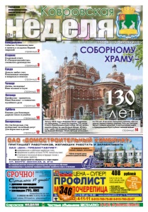 неделя 12+ Ковровская Городская информационноаналитическая газета неделя Ковровская Частные объявления БЕСПЛАТНО: 6-44-07, kn-bizness@mail.ru Понедельник № 33 (150) 15 августа 2014 г. страница 3 Среда Вторник страница 2 Четверг страница 4 Пятница страница 11 ðåêëàìà ÑÐÎ×ÍÎ! Ñåðòèôèêàòû íà ñîîòâåòñòâèå ÃÎÑÒ è Åâðîïåéñêîé íîðìå EN-1176 Îñòàëîñü 17 äíåé! – äåòñêèå ïëîùàäêè – ñïîðòèâíûå êîìïëåêñû – ïëîùàäêè ÃÒÎ, ÍÂÏ Ïîäðîáíîñòè ïî òåë.: 8 (49232) 44-900; 8 (915) 79-30-30-6 e-mail: antey_33@mail.ru; play.antey33.ru ООО «ТПК «АНТЕЙ» д о рОе та лпирзоаецкитиа страница 12 ÎÀÎ «ÄÑÊ» ïðåäîñòàâëÿåò: ñâîåâðåìåííóþ è ñòàáèëüíóþ çàðàáîòíóþ ïëàòó; îôîðìëåíèå íà ðàáîòó ñîãëàñíî ÒÊ ÐÔ, ïîëíûé ñîö.ïàêåò; îò÷èñëåíèÿ â ïåíñèîííûé ôîíä íà áóäóùóþ ïåíñèþ ñ ïîëíîé ñóììû çàðàáîòêà. ÎÀÎ «Äîìîñòðîèòåëüíûé êîìáèíàò» ïðèãëàøàåò ðàáîòíèêîâ, æåëàþùèõ ðàáîòàòü è çàðàáàòûâàòü Òåë. 9-05-35 Ïî âîïðîñàì òðóäîóñòðîéñòâà îáðàùàòüñÿ â îòäåë êàäðîâ: óë. Âîëãî-Äîíñêàÿ, ä. 21à Ïî ñïåöèàëüíîñòÿì îñíîâíîãî ïðîèçâîäñòâà ïðîâîäèòñÿ îáó÷åíèå íà ïðåäïðèÿòèè ñ âûïëàòîé ó÷àùèìñÿ ïîìèìî çàðàáîòêà åùå è ñòèïåíäèè ðåêëàìà Ðàáî÷èå âå÷åðíåé ñìåíû ðàçâîçÿòñÿ äîìîé àâòîáóñîì Íà ïðåäïðèÿòèè èìåþòñÿ ñòîëîâàÿ, ìåäïóíêò, àâòîñòîÿíêà реклама ЦЕНА – СУПЕР! 408 рублей МЕТАЛЛОЧЕРЕПИЦА ПРОФЛИСТ С-8, С-10, С-18, С-21, НС-45, Н-60, ПЛОСКИЙ ЛИСТ акция на С-8 RAL-крашеный 2 м с 10.07 по 15.08 ● ВСЕ ЦВЕТА ● ЛЮБОЙ РАЗМЕР ● ДОБОРНЫЕ ЭЛЕМЕНТЫ ● ТРУБЫ ДЛЯ ЗАБОРА БЕЗ ВЫХОДНЫХ с 9.00 до 19.00 www.metallprofil33.ru ул. Т. Павловского, 1 8 (49232) 4-11-11 8-915-769-79-80 8-915-760-22-07 С-8, 2 м, сорт Б крашеный RAL 346 р. Суббота страница 13 Воскресенье страница 14 Август 2014 года в Коврове богат церковными юбилеями: 19 августа отметит 130-летие Спасо-Преображенский собор, 20 лет исполнилось храму во имя Иоанна Воина, 29 августа – день чествования Феодоровской иконы Божией Матери. Этой святыне исполняется 775 лет. И во всех городских храмах, как и в других православных церквях России, сегодня звучит главная молитва: о ниспослании мира, о прекращении братоубийственной войны. СОБОРНОМУ ХРАМУ – лет страница 14 Событие. Установлен знак в память о солдатах Первой мировой Кадровый ответ. В «Спецавтохозяйстве» сменилось руководство Деньги любят счет. Пенсионные новации в вопросах и ответах Даешь, молодежь! Наш человек в Сеуле Профессия – хранитель. Нина Павлова – о тонкостях музейного дела Пикник для беженцев: дарили тепло и улыбки Не учи безделью, учи рукоделью: полезный досуг для взрослых и детей