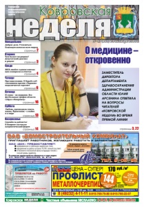 неделя 12+ Ковровская Городская информационноаналитическая газета неделя Ковровская Частные объявления БЕСПЛАТНО: 6-44-07, kn-bizness@mail.ru Понедельник № 43 (160) 24 октября 2014 г. страница 3 Среда Вторник страница 2 Четверг страница 4 ОАО «ДСК» предоставляет: своевременную и стабильную заработную плату; оформление на работу согласно ТК РФ, полный соц.пакет; отчисления в пенсионный фонд на будущую пенсию с полной суммы заработка. ОАО «Домостроительный комбинат» приглашает работников, желающих работать и зарабатывать Тел. 9-05-95 По вопросам трудоустройства обращаться в отдел кадров: ул. Волго-Донская, д. 21а По специальностям основного производства проводится обучение на предприятии с выплатой учащимся помимо заработка еще и стипендии реклама Рабочие вечерней смены развозятся домой автобусом На предприятии имеются столовая, медпункт, автостоянка Пятница страница 6 Суббота страница 16 реклама ЦЕНА – СУПЕР! 170 руб./м2 МЕТАЛЛОЧЕРЕПИЦА ПРОФЛИСТ С-8, С-10, С-18, С-21, НС-45, Н-60, ПЛОСКИЙ ЛИСТ акция на С-8 RAL-крашеный 2 м по 30.09 ● ВСЕ ЦВЕТА ● ЛЮБОЙ РАЗМЕР ● ДОБОРНЫЕ ЭЛЕМЕНТЫ ● ТРУБЫ ДЛЯ ЗАБОРА БЕЗ ВЫХОДНЫХ с 9.00 до 19.00 www.metallprofil33.ru ул. Т. Павловского, 1 8 (49232) 4-11-11 8-915-769-79-80 8-915-760-22-07 р./м2 С-8, 2 м, сорт Б крашеный RAL 144 •СБОРЩИК МАТРАСОВ •НАЛАДЧИК СТАНКОВ •УКЛАДЧИК-УПАКОВЩИК •ПОДСОБНЫЙ РАБОЧИЙ •ШВЕЯ обучение на производстве, работа в сменах 8-919-009-71-71 8(49232) 99-222 реклама страница 14 Воскресенье страница 13 страницы 3, 22 О медицине – откровенно ЗАМЕСТИТЕЛЬ ДИРЕКТОРА ДЕПАРТАМЕНТА ЗДРАВООХРАНЕНИЯ АДМИНИСТРАЦИИ ОБЛАСТИ ЮЛИЯ АРСЕНИНА ОТВЕТИЛА НА ВОПРОСЫ ЧИТАТЕЛЕЙ «КОВРОВСКОЙ НЕДЕЛИ» ВО ВРЕМЯ ПРЯМОЙ ЛИНИИ Спасибо за доблесть! В Коврове состоялся патриотический форум Любовь, прошедшая сквозь жизнь. Фронтовик – о войне и о мире И снова – на вершине. Все футбольные трофеи области собрал «Ковровец» Противостояние. К борьбе собственников против «Экранов» подключается горсовет ЖКХ-ликбез: единая квитанция в вопросах и ответах Чем болеет медицина? Депутатский диагноз и рецепт Доброе дело. Утеплиться беженцам помогли всем миром