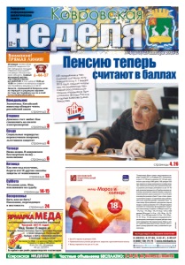 30 января гостем «Ковровской недели» станет начальник государственной жилищной инспекции Владимирской области, главный жилищный инспектор Сергей Сергеевич ШАХРАЙ. В этот день с 10.00 до 12.00 он ответит на вопросы ковровчан телефону редакции 6-44-07. неделя 12+ Ковровская Городская информационноаналитическая газета неделя Ковровская Частные объявления БЕСПЛАТНО: 6-44-07, kn-bizness@mail.ru страницы 4, 26 Понедельник страница 3 Среда Вторник страница 2 Четверг страница 4 Суббота страница 13 Воскресенье страницы 14-15 страница 24 №4 (173) 23 января 2015 г. Пятница страница 6 • Вклад открывается в период с 15 декабря 2014 г. по 28 февраля 2015 г. (включительно). • Валюта вклада – Рубли РФ. • Вклад открывается на любой срок в диапазоне 181-365 дней. • Проценты по вкладу начисляются и выплачиваются ежемесячно. • Дополнительные взносы во вклад разрешены. Пополнение счета прекращается за 30 дней до окончания срока вклада. • При досрочном закрытии вклада, размещенного в банке 91 день и более, проценты начисляются исходя из ½ процентной ставки, действующей на дату заключения договора, в противном случае – по ставке вклада «До востребования». ОАО «МИнБ». Генеральная лицензия Банка России № 912 от 16.09.2014 г. @minb_bank /Minbank.ru www.minbank.ru 8 (800) 100-74-74 * Для социально незащищенной категории Вкладчиков. К социально незащищенной категории Вкладчиков относятся Вкладчики, предъявившие в Банк при открытии вклада пенсионное удостоверение/удостоверение ветерана. Банк оставляет за собой право вносить изменения в условия акции. • Вклад открывается в период с 15 декабря 2014 г. по 28 февраля 2015 г. (включительно). • Валюта вклада – Рубли РФ. • Вклад открывается на любой срок в диапазоне 181-365 дней. • Проценты по вкладу начисляются и выплачиваются ежемесячно. • Дополнительные взносы во вклад разрешены. Пополнение счета прекращается за 30 дней до окончания срока вклада. • При досрочном закрытии вклада, размещенного в банке 91 день и более, проценты начисляются исходя из ½ процентной ставки, действующей на дату заключения договора, в противном случае – по ставке вклада «До востребования». ОАО «МИнБ». Генеральная лицензия Банка России № 912 от 16.09.2014 г. @minb_bank /Minbank.ru www.minbank.ru 8 (800) 100-74-74 * Для социально незащищенной категории Вкладчиков. К социально незащищенной категории Вкладчиков относятся Вкладчики, предъявившие в Банк при открытии вклада пенсионное удостоверение/удостоверение ветерана. Банк оставляет за собой право вносить изменения в условия акции. 8 (49232) 4-37-84, 2-22-41, 4-99-67 реклама *Условия вклада «Мороз и солнце»: вклад открывается в периоде 16 января 2015 г. по 28 февраля 2015 г. включительно, на срок 31, 91, 180 дней и в диапазоне 181 -365 дней; минимальная сумма вклада 30000 рублей, 1000 долларов США/ евро; проценты по вкладу выплачиваются по выбору вкладчика: ежемесячно или в конце срока; дополнительные взносы разрешены для вкладов, размещенных на срок 181-365 дней, пополнение прекращается за 30 дней до окончания срока вклада; при досрочном закрытии вкладов со сроком размещения денежных средств в диапазоне от 181 до 365 дней: если вклад был размещен в Банке 91 день и более, проценты начисляются исходя из 1/2 процентной ставки, действующей на дату заключения договора, в противном случае - по ставке вклада «До востребования»; при досрочном закрытии вкладов со сроком размещения 31,91 и 180 дней проценты начисляются по ставке вклада «До востребовани
