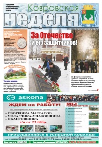 ВЫГОДНО, ИНТЕРЕСНО, А ЕЩЕ И КРАСИВО! «КОВРОВСКАЯ НЕДЕЛЯ» – ПО СОЦИАЛЬНОЙ ЦЕНЕ ВСЕГО ЗА РУБЛЯ ПРИХОДИТЕ И ПОКУПАЙТЕ! неделя 12+ Ковровская Городская информационноаналитическая газета неделя Ковровская Частные объявления БЕСПЛАТНО: 6-44-07, kn-bizness@mail.ru свежие новости, актуальные темы, очерки о земляках, официальная информация, акция «Бессмертный полк», спорт, афиша, объявления, сканворд Также в номере: №9 (178) 27 февраля 2015 г. страница 2 23 февраля Ковров поздравлял служивых, а еще отметил третью годовщину вручения муниципальному образованию грамоты «Город воинской славы» и его защитников! За Отечество реклама