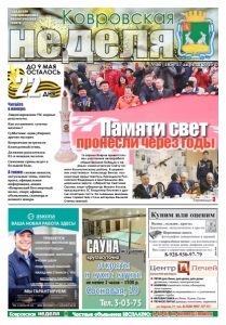 неделя Ковровская Частные объявления БЕСПЛАТНО: 6-44-07, kn-bizness@mail.ru ДО 9 МАЯ ОСТАЛОСЬ 22 ДНЯ 12+неделя Ковровская Городская информационноаналитическая газета №16 (185) 17 апреля 2015 г. Лицензирование УК: первые результаты. Как остановить «утечку мозгов»? Субботник: одни убирают, другие мусорят. Ковровчане встретили Благодатный огонь. Должник расплатился 81-м мешком мелочи. Сжигание травы ведет к большой беде. А также: свежие новости, актуальные темы, советы врача, официальная информация, акция «Ковровский Бессмертный полк», спорт, афиша, объявления, сканворд и немного юмора. Читайте в номере: www.centr-pechey.ru zzПЕЧИ для бани, для дома, для дачи: дровяные, газовые, электрические zzКАМИНЫ каминные топки, облицовки, печи-камины zzДЫМОХОДЫ из нержавейки в т. ч. утепленные сэндвич–трубы zzЕВРОВАГОНКА из Липы, Осины, Сосны zzПЕЧНОЕ ЛИТЬЕ (дверцы, колосники, задвижки) ул. Кирова 77, тел. 8-920-907-37-51 реклама реклама -СБОРЩИК МАТРАСОВ IKEA -КОМПЛЕКТОВЩИК -УПАКОВЩИК МАТРАСОВ -УЧЕНИК ШВЕИ -ПОДСОБНЫЙ РАБОЧИЙ -НАЛАДЧИК СТАНКОВ С ЧПУ БЕЗ ОПЫТА РАБОТЫ!!! СДЕЛЬНАЯ ОПЛАТА ТРУДА ОТ 23000р. реклама Сосновая, 19 не менее 2 часов – 1500 р. Тел. 3-03-75 открыты и сухие сауны! круглосуточно САУНАдо 10 человек реклама 16 апреля Ковров приветствовал участников автопробега «Наша Великая Победа» и передал символическую Свечу памяти Кольчугинскому району. В церемонии участвовали Александр Беглов, полномочный представитель Президента Российской Федерации в Центральном федеральном округе, губернатор Светлана Орлова, вице‑губернатор Михаил Колков, председатель ЗС Владимир Киселев и другие почетные гости. Но главными «виновниками торжества» стали ветераны Великой Отечественной. страница 3 пронесли через годы Памяти свет