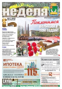 неделя Ковровская Частные объявления БЕСПЛАТНО: 6-44-07, kn-bizness@mail.ru ДО 9 МАЯ ОСТАЛСЯ 1 ДЕНЬ реклама круглосуточно САУНА открыты и сухие сауны! Сосновая, 19 Тел. 3-03-75 не менее 2 часов – 1500 р. до 10 человек 12+неделя Ковровская Городская информационноаналитическая газета №19 (188) 8 мая 2015 г. Ковровские фронтовики побывали на Поклонной горе. Узнала себя на портрете. Главврачам дали срок. На исправление. Лицензия – не бронежилет, от всего не спасет. Санинструктор Емельянова: пусть всегда будет мир! Парки открыли летний сезон. Платим за воду по-новому. А также: свежие новости, актуальные темы, официальная информация, акция «Ковровский Бессмертный полк», спорт, афиша, объявления, сканворд и немного юмора. Читайте в номере: страница 14 www.centr-pechey.ru zzПЕЧИ для бани, для дома, для дачи: дровяные, газовые, электрические zzКАМИНЫ каминные топки, облицовки, печи-камины zzДЫМОХОДЫ из нержавейки в т. ч. утепленные сэндвич-трубы zzЕВРОВАГОНКА из липы, осины, сосны zzПЕЧНОЕ ЛИТЬЕ (дверцы, колосники, задвижки) ул. Кирова 77, тел. 8-920-907-37-51 реклама реклама Поклонимся 2 мая в Коврове началась областная акция, посвященная празднованию юбилея Победы. Город воинской славы к торжеству готов: на обновленной площади Победы вспыхнул Вечный огонь памяти. великим тем годам!