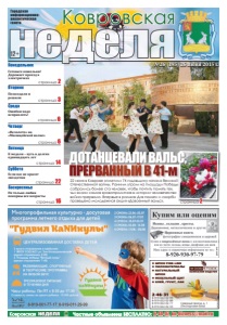 неделя Городская информационноаналитическая газета 12+ Ковровская неделя Ковровская Частные объявления БЕСПЛАТНО: 6-44-07, kn-bizness@mail.ru Понедельник Четверг страница 6 реклама страница 3 Среда Вторник страница 2 №26 (195) 26 июня 2015 г. ● ШПОН FINE-LINE ● ПИЛОМАТЕРИАЛЫ ● НАТУРАЛЬНЫЙ ШПОН ● МЕБЕЛЬНЫЙ ЩИТ ● КЛЕЙ, ГРУНТ, ЛАК Северный проезд, д. 1 (Лесоторговая база) 2-46-31 8-919-022-02-99 8-919-022-02-88 8-919-022-02-77 8-919-022-02-33 КОМПАНИЯ ВУДСТОК реклама реклама Воскресенье страница 22 Суббота страница 14 Пятница страница 6 страница 16 22 июня в Коврове отметили 74 годовщину начала Великой Отечественной войны. Ранним утром на площади Победы собрались более ста человек, чтобы почтить память тех, чьи жизни самая кровопролитная в истории человечества война прервала. Впервые в рамках Дня памяти и скорби проведена молодежная акция «Довоенный вальс». страница 2 ДОТАНЦЕВАЛИ ВАЛЬС, ПРЕРВАННЫЙ В 41-м Готовьте кошельки! Дорожает проезд в электричках Позаседали и решили Ошибки надо исправлять! «Велолето» на «Милицейской волне» К медали – путь в долгих одиннадцать лет Если вас не красят звездочки Не только любви покорны все возрасты