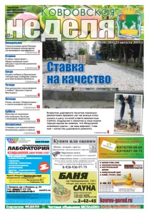 неделя Городская информационноаналитическая газета 12+ Ковровская неделя Ковровская Частные объявления БЕСПЛАТНО: 6-44-07, kn-bizness@mail.ru Понедельник Четверг страница 4 страница 3 Среда Вторник страница 2 №34 (203) 21 августа 2015 г. БАНЯ САУНА Тел. 2-42-45 на Набережной, 13/1 реклама круглосуточно 120 руб. (соц. билет – 80 руб.) 1100 руб. ДНЕМ 1250 руб. ПОСЛЕ 21.00 страница 3 Воскресенье страница 15 Суббота страница 13 Пятница страница 6 страница 18 НОВЫЕ МЕДИЦИНСКИЕ ТЕХНОЛОГИИ ФЕДЕРАЛЬНАЯ СЕТЬ нам 15 лет автоматизированная ЛАБОРАТОРИЯ Прием специалистов: • АЛЛЕРГОЛОГ-ИММУНОЛОГ, • терапевт, • акушер-гинеколог, • гастроэнтеролог, • ревматолог, • уролог • эндокринолог УЗИ, ЭКГ взрослым и детям *ПЕРЕЧЕНЬ И СТОИМОСТЬ АНАЛИЗОВ УТОЧНЯЙТЕ У АДМИНИСТРАТОРА ПРИ РЕГИСТРАЦИИ **ОРГАНИЗАТОР: OOO "КОМПАНИЯ "НОВЫЕ МЕДИЦИНСКИЕ ТЕХНОЛОГИИ". ИНФОРМАЦИЮ ОБ ОРГАНИЗАТОРЕ, МЕСТЕ, СРОКАХ И ПОРЯДКЕ УЧАСТИЯ В АКЦИИ УТОЧНЯЙТЕ ПО ТЕЛ. 6-43-48. OOO "КОМПАНИЯ "НОВЫЕ МЕДИЦИНСКИЕ ТЕХНОЛОГИИ", ОГРН 1133327002698 ИНН 332701001. ЛИЦ. ЛО-33-01-001823 ОТ 3.04.2015 Г. ВЫДАНА ДЕПАРТАМЕНТОМ ЗДРАВООХРАНЕНИЯ ВЛАДИМИРСКОЙ ОБЛАСТИ. г. Ковров, пр-т Ленина, д. 35 тел. 8(49232) 6-43-48, 8-930-830-09-57, 8-900-477-55-11 nmt33.ru ВСЕ ВИДЫ АНАЛИЗОВ, ЗАБОР КРОВИ С 0 ЛЕТ АНАЛИЗЫ В ДЕНЬ ОБРАЩЕНИЯ* РЕКЛАМА ÈÌÅÞÒÑß ÏÐÎÒÈÂÎÏÎÊÀÇÀÍÈß. ÍÅÎÁÕÎÄÈÌÀ ÊÎÍÑÓËÜÒÀÖÈß ÑÏÅÖÈÀËÈÑÒÀ Прием в Коврове (взрослые и дети с 0 лет) аллергологов-иммунологов из г. Владимира: врач высшей категории Русаковская М.Г. кандидат медицинских наук Рябинина З.В. реклама ● ШПОН FINE-LINE ● ПИЛОМАТЕРИАЛЫ ● НАТУРАЛЬНЫЙ ШПОН ● МЕБЕЛЬНЫЙ ЩИТ ● КЛЕЙ, ГРУНТ, ЛАК Северный проезд, д. 1 (Лесоторговая база) 2-46-31 8-919-022-02-99 8-919-022-02-88 8-919-022-02-77 8-919-022-02-33 КОМПАНИЯ ВУДСТОК реклама Читайте нашу газету на сайте kovrov-gorod.ru эквивалент касса взаимопомощи реклама Ставка на качество Вскрытие дорожного полотна показало: ремонтники прежних лет не всегда относились к делу со всей ответственностью. Сейчас подрядчик и заказчик в лице мэрии города едины во мнении, что бездумное освоение сметы – не наш вариант. Главное – качество дорожного ремонта. Счастья в новом доме! Пятнадцати молодым семьям вручили жилищные сертификаты Я знаю, город будет… Общественный совет обсудил стратегию развития Коврова Отдай учебник в Краснодон! Литераторы собирают книги для школьников Донбасса Как рассказать мальчишкам о войне? Арсенал Сергея Мостового Очень личное. Ковровчанин – о своем военном детстве Куколки ее надежды: как победить болезнь с помощью творчества Стикеры для первоклашек: безопасная дорога в школу