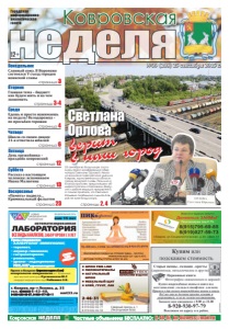 неделя Городская информационноаналитическая газета Ковровская неделя Ковровская Частные объявления БЕСПЛАТНО: 6-44-07, kn-bizness@mail.ru №39 (208) 25 сентября 2015 г. НОВЫЕ МЕДИЦИНСКИЕ ТЕХНОЛОГИИ ФЕДЕРАЛЬНАЯ СЕТЬ нам 15 лет автоматизированная ЛАБОРАТОРИЯ Прием специалистов: • АЛЛЕРГОЛОГ-ИММУНОЛОГ, • терапевт, • акушер-гинеколог, • гастроэнтеролог, • ревматолог, • уролог • эндокринолог УЗИ, ЭКГ взрослым и детям *ПЕРЕЧЕНЬ И СТОИМОСТЬ АНАЛИЗОВ УТОЧНЯЙТЕ У АДМИНИСТРАТОРА ПРИ РЕГИСТРАЦИИ **ОРГАНИЗАТОР: OOO "КОМПАНИЯ "НОВЫЕ МЕДИЦИНСКИЕ ТЕХНОЛОГИИ". ИНФОРМАЦИЮ ОБ ОРГАНИЗАТОРЕ, МЕСТЕ, СРОКАХ И ПОРЯДКЕ УЧАСТИЯ В АКЦИИ УТОЧНЯЙТЕ ПО ТЕЛ. 6-43-48. OOO "КОМПАНИЯ "НОВЫЕ МЕДИЦИНСКИЕ ТЕХНОЛОГИИ", ОГРН 1133327002698 ИНН 332701001. ЛИЦ. ЛО-33-01-001823 ОТ 3.04.2015 Г. ВЫДАНА ДЕПАРТАМЕНТОМ ЗДРАВООХРАНЕНИЯ ВЛАДИМИРСКОЙ ОБЛАСТИ. г. Ковров, пр-т Ленина, д. 35 тел. 8(49232) 6-43-48, 8-930-830-09-57, 8-900-477-55-11 nmt33.ru ВСЕ ВИДЫ АНАЛИЗОВ, ЗАБОР КРОВИ С 0 ЛЕТ АНАЛИЗЫ В ДЕНЬ ОБРАЩЕНИЯ* РЕКЛАМА ÈÌÅÞÒÑß ÏÐÎÒÈÂÎÏÎÊÀÇÀÍÈß. ÍÅÎÁÕÎÄÈÌÀ ÊÎÍÑÓËÜÒÀÖÈß ÑÏÅÖÈÀËÈÑÒÀ Прием в Коврове (взрослые и дети с 0 лет) аллергологов-иммунологов из г. Владимира: врач высшей категории Русаковская М.Г. кандидат медицинских наук Рябинина З.В. ● ШПОН FINE-LINE ● ПИЛОМАТЕРИАЛЫ ● НАТУРАЛЬНЫЙ ШПОН ● МЕБЕЛЬНЫЙ ЩИТ ● КЛЕЙ, ГРУНТ, ЛАК Северный проезд, д. 1 (Лесоторговая база) 2-46-31 8-919-022-02-99 8-919-022-02-88 8-919-022-02-77 8-919-022-02-33 КОМПАНИЯ ВУДСТОК реклама эквивалент касса взаимопомощи реклама Понедельник Четверг страница 4 Воскресенье страница 13 Суббота страница 12 Пятница страница 6 страница 23 страницы 3-4 Среда Вторник страница 3 12+ По понедельникам пенсионерам скидка на стрижку (цена – 120 руб.) Набираются группы: «Мама и малыш» (от 1 до 5 лет); детские группы; группа «Кому за 60» реклама страницы 2, 4 Светлана Орлова верит в наш город 23 сентября во Владимире состоялась пресс-конференция губернатора Светланы Орловой. Немало внимания глава региона уделила Коврову, единственному в области городу воинской славы. Речь шла о благоустройстве, предстоящем общероссийском спортивном форуме и работе ведущих предприятий. А самое приятное, что Светлана Юрьевна пообещала сделать Ковров не хуже Владимира. Славный союз. В Воронеже состоялся V съезд городов воинской славы Главная тема – бюджет: как будем жить и на чем экономить Едешь и просто нажимаешь на педаль! Велодорожка – по просьбам горожан Школа со своим лицом: 21-я отметила юбилей День оружейника – праздник ковровский Рассказ о настоящем человеке: вспоминаем Ивана Малюгина «Память» подвела… Криминальный фельетон