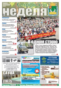 неделя Ковровская Понедельник Четверг страница 4 Пятница страница 6 страница 24 страница 3 Среда Вторник страница 2 12+ №19 (240) 13 мая 2016 г. Городская информационноаналитическая газета Воскресенье страница 22 Суббота страницы 13, 16 НОВЫЕ МЕДИЦИНСКИЕ ТЕХНОЛОГИИ ФЕДЕРАЛЬНАЯ СЕТЬ нам 15 лет медицинская ЛАБОРАТОРИЯ Прием специалистов: • АЛЛЕРГОЛОГИ-ИММУНОЛОГИ Русаковская Марина Геннадьевна, врач высшей категории Рябинина Зоя Викторовна кандидат медицинских наук • терапевт, • акушер-гинеколог, • гастроэнтеролог, • ревматолог, • уролог • эндокринолог УЗИ, ЭКГ взрослым и детям *ПЕРЕЧЕНЬ И СТОИМОСТЬ АНАЛИЗОВ УТОЧНЯЙТЕ У АДМИНИСТРАТОРА ПРИ РЕГИСТРАЦИИ **ОРГАНИЗАТОР: OOO "КОМПАНИЯ "НОВЫЕ МЕДИЦИНСКИЕ ТЕХНОЛОГИИ". ИНФОРМАЦИЮ ОБ ОРГАНИЗАТОРЕ, МЕСТЕ, СРОКАХ И ПОРЯДКЕ УЧАСТИЯ В АКЦИИ УТОЧНЯЙТЕ ПО ТЕЛ. 6-43-48. OOO "КОМПАНИЯ "НОВЫЕ МЕДИЦИНСКИЕ ТЕХНОЛОГИИ", ОГРН 1133327002698 ИНН 332701001. ЛИЦ. ЛО-33-01-001823 ОТ 3.04.2015 Г. ВЫДАНА ДЕПАРТАМЕНТОМ ЗДРАВООХРАНЕНИЯ ВЛАДИМИРСКОЙ ОБЛАСТИ. г. Ковров, пр-т Ленина, д. 35 тел. 8(49232) 6-43-48, 8-930-830-09-57, 8-900-477-55-11 nmt33.ru ВСЕ ВИДЫ АНАЛИЗОВ, ЗАБОР КРОВИ С 0 ЛЕТ АНАЛИЗЫ В ДЕНЬ ОБРАЩЕНИЯ* РЕКЛАМА ÈÌÅÞÒÑß ÏÐÎÒÈÂÎÏÎÊÀÇÀÍÈß. ÍÅÎÁÕÎÄÈÌÀ ÊÎÍÑÓËÜÒÀÖÈß ÑÏÅÖÈÀËÈÑÒÀ АКЦИЯ**с 15 апреля по 31 мая стоимость приема врача-терапевта – 250 рублей взрослые и дети с 0 лет неделя Ковровская Частные объявления БЕСПЛАТНО: 6-44-07, kn-bizness@mail.ru ● ШПОН FINE-LINE ● ПИЛОМАТЕРИАЛЫ (ЭКЗОТИКА) ● НАТУРАЛЬНЫЙ ШПОН ● МЕБЕЛЬНЫЙ ЩИТ ● КЛЕЙ, ГРУНТ, ЛАК ● ТЕРРАСНАЯ ДОСКА Северный проезд, д. 1 Лесоторговая база 2-46-31 2-42-02 8-919-022-02-99 8-919-022-02-88 8-919-022-02-77 8-919-022-02-33 КОМПАНИЯ ВУДСТОК реклама реклама реклама не менее 2 часов – 1750 р. круглосуточно САУНА 3-03-75 до 6 человек Сосновая, 19 реклама страница 14 Около 7 тысяч ковровчан прошли 9 Мая в рядах Бессмертного полка – больше, чем в прошлом, юбилейном году. Шествие полка стало одним из самых волнующих моментов нашего общего главного праздника. Запомнился жителям города и военный парад, и кинотеатр под открытым небом, и замечательный вечерний фейерверк. Не перепутай! С 15 мая автобусы поедут по новым маршрутам Еще не поздно: фото фронтовиков для стелы Бессмертного полка принимают до 1 июня Сертификат на счастье. Молодым семьям помогают купить жилье Добротворский: имя, ставшее фестивалем Первичное голосование. Найди свой счетный участок! Алло, доктор слушает! Олег Зайцев ответил на вопросы читателей «КН» Русские байкеры: взятие Берлина В одном строю Фото Б. Борисова