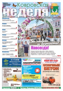 1 №27 Ковровская неделя 8 июля 2016 г. неделя Ковровская Понедельник Четверг страница 4 Пятница страница 6 страница 28 страница 3 Среда Вторник страница 2 12+ №27 (248) 8 июля 2016 г. Городская информационноаналитическая газета Воскресенье страница 23 Суббота страница 13 НОВЫЕ МЕДИЦИНСКИЕ ТЕХНОЛОГИИ ФЕДЕРАЛЬНАЯ СЕТЬ нам 15 лет медицинская ЛАБОРАТОРИЯ Прием специалистов: • терапевт • акушер-гинеколог • гастроэнтеролог, • ревматолог, • уролог • эндокринолог УЗИ, ЭКГ взрослым и детям *ПЕРЕЧЕНЬ И СТОИМОСТЬ АНАЛИЗОВ УТОЧНЯЙТЕ У АДМИНИСТРАТОРА ПРИ РЕГИСТРАЦИИ **ОРГАНИЗАТОР: OOO "КОМПАНИЯ "НОВЫЕ МЕДИЦИНСКИЕ ТЕХНОЛОГИИ". ИНФОРМАЦИЮ ОБ ОРГАНИЗАТОРЕ, МЕСТЕ, СРОКАХ И ПОРЯДКЕ УЧАСТИЯ В АКЦИИ УТОЧНЯЙТЕ ПО ТЕЛ. 6-43-48. OOO "КОМПАНИЯ "НОВЫЕ МЕДИЦИНСКИЕ ТЕХНОЛОГИИ", ОГРН 1133327002698 ИНН 332701001. ЛИЦ. ЛО-33-01-001823 ОТ 3.04.2015 Г. ВЫДАНА ДЕПАРТАМЕНТОМ ЗДРАВООХРАНЕНИЯ ВЛАДИМИРСКОЙ ОБЛАСТИ. г. Ковров, пр-т Ленина, д. 35 тел. 8(49232) 6-43-48, 8-930-830-09-57, 8-900-477-55-11 nmt33.ru ВСЕ ВИДЫ АНАЛИЗОВ, ЗАБОР КРОВИ С 0 ЛЕТ АНАЛИЗЫ В ДЕНЬ ОБРАЩЕНИЯ* РЕКЛАМА ÈÌÅÞÒÑß ÏÐÎÒÈÂÎÏÎÊÀÇÀÍÈß. ÍÅÎÁÕÎÄÈÌÀ ÊÎÍÑÓËÜÒÀÖÈß ÑÏÅÖÈÀËÈÑÒÀ Прием в Коврове (взрослые и дети) аллергологов-иммунологов из г. Владимира: врач высшей категории Русаковская М.Г. кандидат медицинских наук Рябинина З.В. неделя Ковровская Частные объявления БЕСПЛАТНО: 6-44-07, kn-bizness@mail.ru ● ШПОН FINE-LINE ● ПИЛОМАТЕРИАЛЫ (ЭКЗОТИКА) ● НАТУРАЛЬНЫЙ ШПОН ● МЕБЕЛЬНЫЙ ЩИТ ● КЛЕЙ, ГРУНТ, ЛАК ● ТЕРРАСНАЯ ДОСКА Северный проезд, д. 1 Лесоторговая база 2-46-31 2-42-02 8-919-022-02-99 8-919-022-02-88 8-919-022-02-77 8-919-022-02-33 КОМПАНИЯ ВУДСТОК реклама реклама страницы 14-15 Куплю дорого реклама 8-916-594-00-50 АКЦИИ ОАО «ЗиД» ПРОИЗВОДСТВО И ДОСТАВКА БЕТОНА ТОВАРНОГО, РАСТВОРА Работаем без выходных Специальные предложения для строительных фирм, собственников миксеров, прорабов реклама 8-900-586-48-48 Тел.: 44-509 ОТЛИЧНЫИ БЕТОН Сегодня отмечают День семьи, любви и верности. В Муроме прошло торжество с участием Светланы Медведевой. А в Коврове чествуем семьи, прожившие в браке 50 лет, и просто верных и любящих супругов. За любовь и верность! Навсегда! «Дорогая Машуня, уходим в бой» – семейные истории Отметили лучших дорожных полицейских Легендарный космонавт Павел Попович был и в Коврове Проверка детских лагерей на безопасность Где починят дороги? Детские площадки от депутата Игошина Указатель к юбилею завода имени В.А. Дегтярева