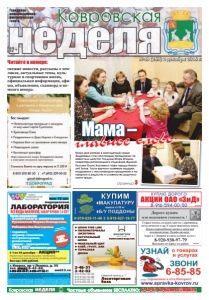 №48 (269) 2 декабря 2016 г. неделя Ковровская Частные объявления БЕСПЛАТНО: 6-44-07, kn-bizness@mail.ru страница 3 неделя Ковровская 12+ Городская информационноаналитическая газета НОВЫЕ МЕДИЦИНСКИЕ ТЕХНОЛОГИИ ФЕДЕРАЛЬНАЯ СЕТЬ нам 15 лет медицинская ЛАБОРАТОРИЯ Прием специалистов: • АЛЛЕРГОЛОГИ-ИММУНОЛОГИ Русаковская Марина Геннадьевна, врач высшей категории Рябинина Зоя Викторовна кандидат медицинских наук • терапевт, • акушер-гинеколог, • гастроэнтеролог, • ревматолог, • уролог • эндокринолог УЗИ, ЭКГ взрослым и детям *ПЕРЕЧЕНЬ И СТОИМОСТЬ АНАЛИЗОВ УТОЧНЯЙТЕ У АДМИНИСТРАТОРА ПРИ РЕГИСТРАЦИИ ** МЕСТО ПРОВЕДЕНИЯ АКЦИИ: Г. КОВРОВ ПР. ЛЕНИНА Д. 35 (ТЕЛ. 6-43-48.) С 01.12.16 ПО 30.01.2016 Г. АКЦИЮ ПРОВОДИТ ООО «МЕДЛАЙН» ЛИЦЕНЗИЯ № ЛО-33-01-001806 ОТ 05.03.15Г. ВЫДАНА ДЕПАРТАМЕНТОМ ЗДРАВООХРАНЕНИЯ АДМИНИСТРАЦИИ ВЛАДИМИРСКОЙ ОБЛАСТИ. ОГРН 1143327006459, ИНН 3327124955. г. Ковров, пр-т Ленина, д. 35 тел. 8(49232) 6-43-48, 8-930-830-09-57, 8-900-477-55-11 nmt33.ru ВСЕ ВИДЫ АНАЛИЗОВ, ЗАБОР КРОВИ С 0 ЛЕТ АНАЛИЗЫ В ДЕНЬ ОБРАЩЕНИЯ* РЕКЛАМА ÈÌÅÞÒÑß ÏÐÎÒÈÂÎÏÎÊÀÇÀÍÈß. ÍÅÎÁÕÎÄÈÌÀ ÊÎÍÑÓËÜÒÀÖÈß ÑÏÅÖÈÀËÈÑÒÀ взрослые и дети с 0 лет С 1 по 30 декабря – АКЦИЯ** первичный прием акушера-гинеколога + гинекологичекий мазок на флору за 600 рублей. Выгода 580 рублей. реклама Куплю дорого реклама 8-916-594-00-50 АКЦИИ ОАО «ЗиД» ● ШПОН FINE-LINE ● ПИЛОМАТЕРИАЛЫ (ЭКЗОТИКА) ● НАТУРАЛЬНЫЙ ШПОН ● МЕБЕЛЬНЫЙ ЩИТ ● КЛЕЙ, ГРУНТ, ЛАК ● ТЕРРАСНАЯ ДОСКА Северный проезд, д. 1 Лесоторговая база 2-46-31 2-42-02 8-919-022-02-99 8-919-022-02-88 8-919-022-02-77 8-919-022-02-33 КОМПАНИЯ ВУДСТОК реклама реклама реклама реклама свежие новости, рассказы о земляках, актуальные темы, культурная и спортивная жизнь, официальная информация, афиша, объявления, сканворд и немного юмора. Читайте в номере: Канун Дня матери в многодетной семье Андреевых стал настоящим праздником: их навестили депутат Госдумы Игорь Игошин, секретарь регионального отделения «Единой России» Ольга Хохлова и глава города Анатолий Зотов. Гости вручили хозяевам подарки, поздравили с наступающим праздником и поговорили о радостях и сложностях родительского труда. Мама – главное слово