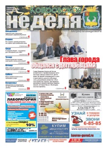 неделя Ковровская 12+ НОВЫЕ МЕДИЦИНСКИЕ ТЕХНОЛОГИИ ФЕДЕРАЛЬНАЯ СЕТЬ нам 15 лет медицинская ЛАБОРАТОРИЯ Прием специалистов: • АЛЛЕРГОЛОГИ-ИММУНОЛОГИ Русаковская Марина Геннадьевна, врач высшей категории Рябинина Зоя Викторовна кандидат медицинских наук • терапевт, • акушер-гинеколог, • гастроэнтеролог, • ревматолог, • уролог • эндокринолог УЗИ, ЭКГ взрослым и детям *ПЕРЕЧЕНЬ И СТОИМОСТЬ АНАЛИЗОВ УТОЧНЯЙТЕ У АДМИНИСТРАТОРА ПРИ РЕГИСТРАЦИИ ** МЕСТО ПРОВЕДЕНИЯ АКЦИИ: Г. КОВРОВ ПР. ЛЕНИНА Д. 35 (ТЕЛ. 6-43-48.) С 01.12.16 ПО 30.01.2016 Г. АКЦИЮ ПРОВОДИТ ООО «МЕДЛАЙН» ЛИЦЕНЗИЯ № ЛО-33-01-001806 ОТ 05.03.15Г. ВЫДАНА ДЕПАРТАМЕНТОМ ЗДРАВООХРАНЕНИЯ АДМИНИСТРАЦИИ ВЛАДИМИРСКОЙ ОБЛАСТИ. ОГРН 1143327006459, ИНН 3327124955. г. Ковров, пр-т Ленина, д. 35 тел. 8(49232) 6-43-48, 8-930-830-09-57, 8-900-477-55-11 nmt33.ru ВСЕ ВИДЫ АНАЛИЗОВ, ЗАБОР КРОВИ С 0 ЛЕТ АНАЛИЗЫ В ДЕНЬ ОБРАЩЕНИЯ* РЕКЛАМА ÈÌÅÞÒÑß ÏÐÎÒÈÂÎÏÎÊÀÇÀÍÈß. ÍÅÎÁÕÎÄÈÌÀ ÊÎÍÑÓËÜÒÀÖÈß ÑÏÅÖÈÀËÈÑÒÀ взрослые и дети с 0 лет С 1 по 15 января СКИДКА на все виды анализов, ЭКГ, УЗИ 10% реклама ● ШПОН FINE-LINE ● ПИЛОМАТЕРИАЛЫ (ЭКЗОТИКА) ● НАТУРАЛЬНЫЙ ШПОН ● МЕБЕЛЬНЫЙ ЩИТ ● КЛЕЙ, ГРУНТ, ЛАК ● ТЕРРАСНАЯ ДОСКА Северный проезд, д. 1 Лесоторговая база 2-46-31 2-42-02 8-919-022-02-99 8-919-022-02-88 8-919-022-02-77 8-919-022-02-33 КОМПАНИЯ ВУДСТОК реклама Читайте нашу газету на сайте kovrov-gorod.ru РЕКЛАМА реклама №3 (276) 20 января 2017 г. Понедельник Четверг страница 6 Пятница страница 13 страница 23 страница 5 Среда Вторник страница 4 Воскресенье страница 22 Суббота страница 14 Городская информационноаналитическая газета страница 3 Глава Коврова Анатолий Зотов встретился с профсоюзными активистами завода имени В.А. Дегтярева. Во время откровенного и конструктивного диалога обсуждалось дальнейшее развитие и благоустройство города. Дегтяревцы высказали немало дельных предложений, которые были с благодарностью приняты. Глава города общался с дегтярёвцами Горячая тема. Депутаты обсуждают дорожный ремонт Не стареют душой ветераны: он строил троллейбусное депо О зимней уборке – из первых рук. Интервью для «КН» Рождественские чтения: наш край в эпоху революций Юбилейный держите шаг! Торжества прошли в дивизии Воды живительная сила: традиции и вера Аккуратнее со спиртным! За что магазину поставили двойку