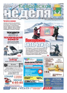 неделя Ковровская 12+ НОВЫЕ МЕДИЦИНСКИЕ ТЕХНОЛОГИИ ФЕДЕРАЛЬНАЯ СЕТЬ нам 15 лет медицинская ЛАБОРАТОРИЯ Прием специалистов: • АЛЛЕРГОЛОГ-ИММУНОЛОГ Русаковская Марина Геннадьевна, врач высшей категории • терапевт, • акушер-гинеколог, • гастроэнтеролог, • ревматолог, • уролог • эндокринолог УЗИ, ЭКГ взрослым и детям ПЕРЕЧЕНЬ И СТОИМОСТЬ АНАЛИЗОВ УТОЧНЯЙТЕ У АДМИНИСТРАТОРА ПРИ РЕГИСТРАЦИИ МЕСТО ПРОВЕДЕНИЯ АКЦИИ: Г. КОВРОВ ПР. ЛЕНИНА Д. 35 (ТЕЛ. 6-43-48.) С 20.02.2017 ПО 27.02.2017, АКЦИЮ ПРОВОДИТ ООО «МЕДЛАЙН» ЛИЦЕНЗИЯ № ЛО-33-01-001806 ОТ 05.03.15Г. ВЫДАНА ДЕПАРТАМЕНТОМ ЗДРАВООХРАНЕНИЯ АДМИНИСТРАЦИИ ВЛАДИМИРСКОЙ ОБЛАСТИ. ОГРН 1143327006459, ИНН 3327124955. СКИДКИ ПО АКЦИИ И ДИСКОНТНЫМ КАРТАМ НЕ СУММИРУЮТСЯ nmt33.ru ВСЕ ВИДЫ АНАЛИЗОВ, ЗАБОР КРОВИ С 0 ЛЕТ АНАЛИЗЫ В ДЕНЬ ОБРАЩЕНИЯ* РЕКЛАМА ÈÌÅÞÒÑß ÏÐÎÒÈÂÎÏÎÊÀÇÀÍÈß. ÍÅÎÁÕÎÄÈÌÀ ÊÎÍÑÓËÜÒÀÖÈß ÑÏÅÖÈÀËÈÑÒÀ С 20 по 27 февраля СКИДКА мужчинам на все виды услуг 10% г. Ковров, пр-т Ленина, д. 35 тел. 8(49232) 6-43-48, 8-930-830-09-57, 8-900-477-55-11 реклама ● ШПОН FINE-LINE ● ПИЛОМАТЕРИАЛЫ (ЭКЗОТИКА) ● НАТУРАЛЬНЫЙ ШПОН ● МЕБЕЛЬНЫЙ ЩИТ ● КЛЕЙ, ГРУНТ, ЛАК ● ТЕРРАСНАЯ ДОСКА Северный проезд, д. 1 Лесоторговая база 2-46-31 2-42-02 8-919-022-02-99 8-919-022-02-88 8-919-022-02-77 8-919-022-02-33 КОМПАНИЯ ВУДСТОК реклама реклама Читайте в номере: свежие новости, рассказы о земляках, актуальные темы, культурная и спортивная жизнь, официальная информация, афиша, объявления, сканворд и немного юмора. №5 (278) 3 февраля 2017 г. Городская информационноаналитическая газета страница 14 Техцентр на Еловой, 1-в Предлагает вам технический осмотр всех категорий автотранспорта Без шума и пыли реклама 100% успеха Тел.: 8(49232) 4-79-26 www.autoservice33.ru Оформление полиса ОСАГО на месте Флаг Коврова, а также флаг Владимирской области были развернуты на пике Винсона в Антарктиде нашим земляком Алексеем Балакиным, покорившим эту вершину. После возвращения Алексея из трудного путешествия с ним встретился корреспондент «КН» и расспросил о подробностях его приключений. Покорение АНТАРКТИДЫ