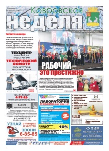 неделя Ковровская 12+ НОВЫЕ МЕДИЦИНСКИЕ ТЕХНОЛОГИИ ФЕДЕРАЛЬНАЯ СЕТЬ нам 15 лет медицинская ЛАБОРАТОРИЯ Прием специалистов: • АЛЛЕРГОЛОГ-ИММУНОЛОГ Русаковская Марина Геннадьевна, врач высшей категории • терапевт, • акушер-гинеколог, • гастроэнтеролог, • ревматолог, • уролог • эндокринолог УЗИ, ЭКГ взрослым и детям ПЕРЕЧЕНЬ И СТОИМОСТЬ АНАЛИЗОВ УТОЧНЯЙТЕ У АДМИНИСТРАТОРА ПРИ РЕГИСТРАЦИИ МЕСТО ПРОВЕДЕНИЯ АКЦИИ: Г. КОВРОВ ПР. ЛЕНИНА Д. 35 (ТЕЛ. 6-43-48.) С 20.02.2017 ПО 27.02.2017, АКЦИЮ ПРОВОДИТ ООО «МЕДЛАЙН» ЛИЦЕНЗИЯ № ЛО-33-01-001806 ОТ 05.03.15Г. ВЫДАНА ДЕПАРТАМЕНТОМ ЗДРАВООХРАНЕНИЯ АДМИНИСТРАЦИИ ВЛАДИМИРСКОЙ ОБЛАСТИ. ОГРН 1143327006459, ИНН 3327124955. СКИДКИ ПО АКЦИИ И ДИСКОНТНЫМ КАРТАМ НЕ СУММИРУЮТСЯ nmt33.ru ВСЕ ВИДЫ АНАЛИЗОВ, ЗАБОР КРОВИ С 0 ЛЕТ АНАЛИЗЫ В ДЕНЬ ОБРАЩЕНИЯ* РЕКЛАМА ÈÌÅÞÒÑß ÏÐÎÒÈÂÎÏÎÊÀÇÀÍÈß. ÍÅÎÁÕÎÄÈÌÀ ÊÎÍÑÓËÜÒÀÖÈß ÑÏÅÖÈÀËÈÑÒÀ С 20 по 27 февраля СКИДКА мужчинам на все виды услуг 10% г. Ковров, пр-т Ленина, д. 35 тел. 8(49232) 6-43-48, 8-930-830-09-57, 8-900-477-55-11 реклама ● ШПОН FINE-LINE ● ПИЛОМАТЕРИАЛЫ (ЭКЗОТИКА) ● НАТУРАЛЬНЫЙ ШПОН ● МЕБЕЛЬНЫЙ ЩИТ ● КЛЕЙ, ГРУНТ, ЛАК ● ТЕРРАСНАЯ ДОСКА Северный проезд, д. 1 Лесоторговая база 2-46-31 2-42-02 8-919-022-02-99 8-919-022-02-88 8-919-022-02-77 8-919-022-02-33 КОМПАНИЯ ВУДСТОК реклама реклама Читайте в номере: свежие новости, рассказы о земляках, актуальные темы, культурная и спортивная жизнь, официальная информация, афиша, объявления, сканворд и немного юмора. №6 (279) 10 февраля 2017 г. Городская информационноаналитическая газета страница 14 Техцентр на Еловой, 1-в Предлагает вам технический осмотр всех категорий автотранспорта Без шума и пыли реклама 100% успеха Тел.: 8(49232) 4-79-26 www.autoservice33.ru Оформление полиса ОСАГО на месте это престижно РАБОЧИЙ – 7 февраля в Коврове открылся Межрегиональный чемпионат «Молодые профессионалы» по стандартам «WorldSkills». Площадкой для него уже во второй раз стал КЭМЗ. Губернатор Светлана Орлова на открытии подчеркнула: «Рабочий класс сегодня – это элита России! Молодые высокоинтеллектуальные профессионалы, имеющие золотые руки и хорошо знающие компьютер и современнейшую технику – будущее нашей страны!»