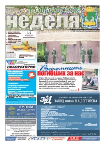 неделя Ковровская 12+ Городская информационноаналитическая газета НОВЫЕ МЕДИЦИНСКИЕ ТЕХНОЛОГИИ медицинская ЛАБОРАТОРИЯ Прием специалистов: • АЛЛЕРГОЛОГ- ИММУНОЛОГ Русаковская Марина Геннадьевна, врач высшей категории из г. Владимира • терапевт, • акушер-гинеколог, • гастроэнтеролог, • ревматолог, • уролог • эндокринолог УЗИ, ЭКГ взрослым и детям *Перечень и стоимость анализов уточняйте у администратора при регистрации Лицензия № ЛО-33-01-001806 от 05.03.15г. выдана департаментом здравоохранения администрации Владимирской области. ОГРН 1143327006459, ИНН 3327124955. nmt33.ru ВСЕ ВИДЫ АНАЛИЗОВ, ЗАБОР КРОВИ С 0 ЛЕТ АНАЛИЗЫ В ДЕНЬ ОБРАЩЕНИЯ* РЕКЛАМА ÈÌÅÞÒÑß ÏÐÎÒÈÂÎÏÎÊÀÇÀÍÈß. ÍÅÎÁÕÎÄÈÌÀ ÊÎÍÑÓËÜÒÀÖÈß ÑÏÅÖÈÀËÈÑÒÀ г. Ковров, пр-т Ленина, д. 35, 8-930-830-09-57, 8-900-477-55-11 тел. 8(49232) 6-43-48, реклама ● ШПОН FINE-LINE ● ПИЛОМАТЕРИАЛЫ (ЭКЗОТИКА) ● НАТУРАЛЬНЫЙ ШПОН ● МЕБЕЛЬНЫЙ ЩИТ ● КЛЕЙ, ГРУНТ, ЛАК ● ТЕРРАСНАЯ ДОСКА Северный проезд, д. 1 Лесоторговая база 2-42-02 8-919-022-02-99 8-919-022-02-88 8-919-022-02-77 8-919-022-02-33 КОМПАНИЯ ВУДСТОК реклама реклама №25 (298) 23 июня 2017 г. страница 3 - ØËÈÔÎÂÙÈÊ 4-6 ðàçðÿäîâ - ÃÀËÜÂÀÍÈÊ 4-5 ðàçðÿäîâ - ÄÎÂÎÄ×ÈÊ-ÏÐÈÒÈÐÙÈÊ 5-6 ðàçðÿäîâ - ÑËÅÑÀÐÜ ÌÅÕÀÍÎÑÁÎÐÎ×ÍÛÕ ÐÀÁÎÒ 4-6 ðàçðÿäîâ - ÒÎÊÀÐÜ 4-6 ðàçðÿäîâ - ÎÏÅÐÀÒÎÐ ÑÒÀÍÊÎÂ Ñ ÏÓ 4-6 ðàçðÿäîâ - ÂÎÄÈÒÅËÜ êàòåãîðèè Â,Ñ,Å - ÝËÅÊÒÐÎÌÎÍÒÅÐ ïî ðåìîíòó è îáñëóæèâàíèþ îáîðóäîâàíèÿ, 5-6 ðàçðÿäîâ - ÌÅÄÈÖÈÍÑÊÀß ÑÅÑÒÐÀ (ïî äèåòè÷åñêîìó ïèòàíèþ) - ÝËÅÒÐÎÕÈÌÎÁÐÀÁÎÒ×ÈÊ 5-6 ðàçðÿäîâ - ÍÀËÀÄ×ÈÊ òåõíîëîãè÷åñêîãî îáîðóäîâàíèÿ (óíèâåðñàë), 5-6 ðàçðÿäîâ ÇÀÐÏËÀÒÀ ÎÒ 30 000 ÐÓÁËÅÉ ïîëíûé ñîöèàëüíûé ïàêåò îôèöèàëüíîå òðóäîóñòðîéñòâî ñòàáèëüíàÿ çàðàáîòíàÿ ïëàòà ÏÐÎÈÇÂÎÄÈÒ ÍÀÁÎÐ Утром 22 июня на площади Победы состоялся митинг-реквием, посвященный началу Великой Отечественной войны. В нем приняли участие руководители города, депутаты, представители общественных организаций и национальных диаспор, ветераны, полицейские, дети и молодежь. Фото А. Соколова погибших за нас Âñïîìíèòü