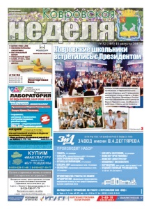 неделя Ковровская 12+ Городская информационноаналитическая газета реклама ● ШПОН FINE-LINE ● ПИЛОМАТЕРИАЛЫ (ЭКЗОТИКА) ● НАТУРАЛЬНЫЙ ШПОН ● МЕБЕЛЬНЫЙ ЩИТ ● КЛЕЙ, ГРУНТ, ЛАК ● ТЕРРАСНАЯ ДОСКА Северный проезд, д. 1 Лесоторговая база 2-42-02 8-919-022-02-99 8-919-022-02-88 8-919-022-02-77 8-919-022-02-33 КОМПАНИЯ ВУДСТОК реклама реклама №32 (305) 11 августа 2017 г. страница 3 – ÒÎÊÀÐÜ, 3-6 ðàçðÿäîâ – ÑËÅÑÀÐÜ, ìåõàíîñáîðî÷íûõ ðàáîò 3-6 ðàçðÿäîâ – ÝËÅÊÒÐÎÕÈÌÎÁÐÀÁÎÒ×ÈÊ – ÊÓÇÍÅÖ-ØÒÀÌÏÎÂÙÈÊ, 3-6 ðàçðÿäîâ – ÑËÅÑÀÐÜ ÀÂÐ êàíàëèçàöèîííûõ ñåòåé, 4-6 ðàçðÿäîâ – ÎÁÕÎÄ×ÈÊ âîäîïðîâîäíî-êàíàëèçàöèîííûõ ñåòåé, 3-6 ðàçðÿäîâ – ÑËÅÑÀÐÜ-ÑÀÍÒÅÕÍÈÊ, 5-6 ðàçðÿäîâ – ÈÍÆÅÍÅÐ-ÏÐÎÃÐÀÌÌÈÑÒ – ÈÍÆÅÍÅÐ-ÊÎÍÑÒÐÓÊÒÎÐ – ÌÀØÈÍÈÑÒ ÝÊÑÊÀÂÀÒÎÐÀ – ÏÅÐÅÂÎÄ×ÈÊ (àíãë. ÿçûê), îïûò íå ìåíåå 2-õ ëåò – ÕÓÄÎÆÅÑÒÂÅÍÍÛÉ ÐÓÊÎÂÎÄÈÒÅËÜ (â «ÄÊ èì. Â.À. Äåãòÿð¸âà») ÏÐÎÈÇÂÎÄÈÒ ÍÀÁÎÐ ÎÁÐÀÙÀÒÜÑß Â ÓÏÐÀÂËÅÍÈÅ ÏÎ ÐÀÁÎÒÅ Ñ ÏÅÐÑÎÍÀËÎÌ ÎÀÎ «ÇÈÄ»: óë. Òðóäà, ä. 4, 1 ýòàæ, êàá. ¹3, ïíä. – ïò. ñ 8.00 äî 12. Òåë.: (49232) 9-10-40, 9-19-34 ÏÐÅÈÌÓÙÅÑÒÂÀ ÐÀÁÎÒÛ ÍÀ ÍÀØÅÌ ÏÐÅÄÏÐÈßÒÈÈ: îôèöèàëüíîå òðóäîóñòðîéñòâî, ìåäèöèíñêèé îñìîòð çà ñ÷åò ñðåäñòâ ïðåäïðèÿòèÿ, âûñîêàÿ çàðàáîòíàÿ ïëàòà ðåêëàìà НОВЫЕ МЕДИЦИНСКИЕ ТЕХНОЛОГИИ медицинская ЛАБОРАТОРИЯ Прием специалистов: • АЛЛЕРГОЛОГ-ИММУНОЛОГ Русаковская Марина Геннадьевна, врач высшей категории из г. Владимира Борута Ирина Павловна, врач высшей категории из г. Владимира (прием с 0 лет) • терапевт, • акушер-гинеколог, • гастроэнтеролог, • ревматолог, • уролог • эндокринолог УЗИ, ЭКГ взрослым и детям *Перечень и стоимость анализов уточняйте у администратора при регистрации **место проведения акции: г. Ковров пр-т Ленина, д. 35 (тел. 6-43-48.) с 5.08.2017 по 5.09.2017. Акцию проводит ООО «Медлайн».Лицензия№ЛО-33-01-001806от05.03.15г.выданадепартаментомздравоохраненияадминистрацииВладимирской области. ОГРН 1143327006459, ИНН 3327124955. скидки по акции и дисконтным картам не суммируются nmt33.ru ВСЕ ВИДЫ АНАЛИЗОВ, ЗАБОР КРОВИ С 0 ЛЕТ АНАЛИЗЫ В ДЕНЬ ОБРАЩЕНИЯ* РЕКЛАМА ИÌÅÞТСß ÏÐОТИВОÏОÊÀÇÀНИß. НÅОÁÕОÄИÌÀ ÊОНСÓËÜТÀÖИß СÏÅÖИÀËИСТÀ г. Ковров, пр-т Ленина, д. 35, 8-930-830-09-57, 8-900-477-55-11 тел. 8(49232) 6-43-48, АКЦИЯ!* с 5 августа до 5 сентября сдай 4 гормона щитовидной железы и получи УЗИ ЩИТОВИДНОЙ ЖЕЛЕЗЫ В ПОДАРОК** ЭКОНОМИЯ 550 РУБЛЕЙ Ковровские школьники встретились с Президентом Самым незабываемым моментом пребывания в образовательном центре «Сириус» для 11 ковровских школьников стала встреча с Владимиром Путиным. Президент России посетил образовательный центр на берегу Черного моря, пообщался с ребятами, ответил на их вопросы.