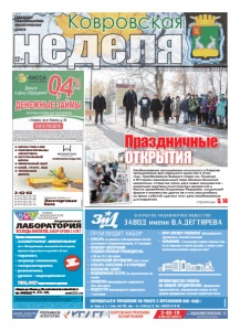 неделя Ковровская 12+ Городская информационноаналитическая газета ● ШПОН FINE-LINE ● ПИЛОМАТЕРИАЛЫ (ЭКЗОТИКА) ● НАТУРАЛЬНЫЙ ШПОН ● МЕБЕЛЬНЫЙ ЩИТ ● КЛЕЙ, ГРУНТ, ЛАК ● ТЕРРАСНАЯ ДОСКА Северный проезд, д. 1 Лесоторговая база 2-42-02 8-919-022-02-99 8-919-022-02-88 8-919-022-02-77 8-919-022-02-33 КОМПАНИЯ ВУДСТОК реклама №46 (319) 10 ноября 2017 г. – ÑËÅÑÀÐÜ ïî ðåìîíòó è îáñëóæèâàíèþ ñèñòåì âåíòèëÿöèè è êîíäèöèîíèðîâàíèÿ, 3-4 ðàçðÿäîâ – ÈÍÆÅÍÅÐ-ÝËÅÊÒÐÎÍÈÊ – ÕÓÄÎÆÅÑÒÂÅÍÍÛÉ ÐÓÊÎÂÎÄÈÒÅËÜ â ÄÊ èì. Â.À. Äåãòÿð¸âà – ÒÅÕÍÈ×ÅÑÊÈÉ ÏÅÐÅÂÎÄ×ÈÊ (àíãë. ÿçûê) – ÑËÅÑÀÐÜ-ÑÀÍÒÅÕÍÈÊ 4-6 ÐÀÇÐßÄΠ– ÌÀÒÅÌÀÒÈÊ (ÑÀÏÐ) – ÌÅÄÈÖÈÍÑÊÀß ÑÅÑÒÐÀ (ïî äèåòè÷åñêîìó ïèòàíèþ) – ÀÊÓØÅÐÊÀ ôåëüäøåðñêîãî çäðàâïóíêòà (áåç êàòåãîðèè) – ÌÅÄÑÅÑÒÐÀ ôåëüäøåðñêîãî çäðàâïóíêòà, 1 êàòåãîðèè – ÂÐÀ× ÀÊÓØÅÐ-ÃÈÍÅÊÎËÎà ôåëüäøåðñêîãî çäðàâïóíêòà, âûñøåé êàòåãîðèè – ÃÀËÜÂÀÍÈÊ, 4-5 ðàçðÿäîâ (êðîìå çàíÿòûõ òîëüêî íà ïîäâåñêå è ñíÿòèè äåòàëåé, à òàêæå â àâòîìàòè÷åñêîì ðåæèìå çàêðûòûõ âàíí) ÏÐÎÈÇÂÎÄÈÒ ÍÀÁÎÐ ÎÁÐÀÙÀÒÜÑß Â ÓÏÐÀÂËÅÍÈÅ ÏÎ ÐÀÁÎÒÅ Ñ ÏÅÐÑÎÍÀËÎÌ ÎÀÎ «ÇèÄ»: óë. Òðóäà, ä. 4, 1 ýòàæ, êàá. ¹3, ïíä. – ïò. ñ 8.00 äî 12. Òåë.: (49232) 9-10-40 ðåêëàìà ÏÐÅÈÌÓÙÅÑÒÂÀ ÐÀÁÎÒÛ ÍÀ ÍÀØÅÌ ÏÐÅÄÏÐÈßÒÈÈ: îôèöèàëüíîå òðóäîóñòðîéñòâî, ìåäèöèíñêèé îñìîòð çà ñ÷åò ñðåäñòâ ïðåäïðèÿòèÿ, âûñîêàÿ çàðàáîòíàÿ ïëàòà НОВЫЕ МЕДИЦИНСКИЕ ТЕХНОЛОГИИ медицинская ЛАБОРАТОРИЯ Прием специалистов: • АЛЛЕРГОЛОГ-ИММУНОЛОГ из г. Владимира, высшей категории, прием взрослых и детей с 0 лет • терапевт, • акушер-гинеколог, • гастроэнтеролог, • ревматолог, • уролог • эндокринолог УЗИ, ЭКГ взрослым и детям *Перечень и стоимость анализов уточняйте у администратора при регистрации. Лицензия № ЛО-33-01-001806 от 05.03.15 г. выдана департаментом здравоохранения администрации Владимирской области. ОГРН 1143327006459, ИНН 3327124955. скидки по акции и дисконтным картам не суммируются nmt33.ru ВСЕ ВИДЫ АНАЛИЗОВ, ЗАБОР КРОВИ С 0 ЛЕТ АНАЛИЗЫ В ДЕНЬ ОБРАЩЕНИЯ* РЕКЛАМА ÈÌÅÞÒÑß ÏÐÎÒÈÂÎÏÎÊÀÇÀÍÈß. ÍÅÎÁÕÎÄÈÌÀ ÊÎÍÑÓËÜÒÀÖÈß ÑÏÅÖÈÀËÈÑÒÀ г. Ковров, пр-т Ленина, д. 35, 8-930-830-09-57, 8-900-477-55-11 тел. 8(49232) 6-43-48, страницы 3, 14 Необыкновенно насыщенным получилось в Коврове празднование Дня народного единства в этом году. Преображение бывшего парка им. Пушкина в Историко-мемориальный парк «Иоанно-Воинский некрополь», открытие сразу двух новых монументов – памятника жертвам политических репрессий и бюста оружейника Владимира Федорова, солдатский форум и множество других не столь масштабных, но ярких событий сделали этот день незабываемым для ковровчан. Праздничные ОТКРЫТИЯ