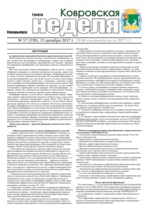 № 57 15 декабря 2017 г. 2 в) на крышах, балконах, лоджиях и выступающих частях фасадов зданий (сооружений); г) на сценических площадках, стадионах и иных спортивных сооружениях; д) во время проведения митингов, демонстраций, шествий и пикетирования; е) на территориях особо ценных объектов культурного наследия народов Российской Федерации, памятников истории и культуры, кладбищ и культовых сооружений, заповедников, заказников и национальных парков. Действия в случае отказов, утилизация негодных изделий Важно помнить, что в случае если фитиль погас или прогорел, а изделие не начало работать, следует: Выждать 10 минут, чтобы удостовериться в отказе; Подойти к фейерверочному изделию и провести визуальный осмотр изделия, чтобы удостовериться в отсутствии тлеющих частей. Категорически запрещается наклоняться над изделием. Последующие действия можно выполнять, только убедившись в отсутствии тлеющих частей; Собрать и уничтожить не сработавшее фейерверочное изделие. Уничтожают фейерверочные изделия, поместив их в воду на срок не менее 24 часов. После этого их можно выбросить с бытовым мусором. Категорически запрещается сжигать фейерверочные изделия на кострах. ПОСТАНОВЛЕНИЕ АДМИНИСТРАЦИИ ГОРОДА КОВРОВА ВЛАДИМИРСКОЙ ОБЛАСТИ № 3615 ОТ 13.12.2017 Г. О внесении дополнений в постановление администрации г. Коврова от 08.12.2017 № 3580 «О назначении даты проведения публичных слушаний по проекту планировки и проекту межевания территории, ограниченной улицами: Белинского, Текстильная, 1-я Овражная» В связи с технической ошибкой, руководствуясь Уставом муниципального образования город Ковров, постановляю: 1. Внести дополнение в постановление администрации г.Коврова от 08.12.2017 № 3580, изложив пункт 1 в следующей редакции: «Председателю комиссии по землепользованию и застройке города Коврова провести публичные слушания по проекту планировки и проекту межевания территории, ограниченной улицами: Белинского, Текстильная, 1-я Овражная». 2. Контроль за исполнением настоящего постановления оставляю за собой. 3. Настоящее постановление вступает в силу со дня его подписания и подлежит официальному опубликованию. И.о. главы города А.Ф. Бобров ПОСТАНОВЛЕНИЕ АДМИНИСТРАЦИИ ГОРОДА КОВРОВА ВЛАДИМИРСКОЙ ОБЛАСТИ № 3616 ОТ 13.12.2017 Г. О подготовке проекта внесения изменений в Правила землепользования и застройки города Коврова На основании Градостроительного кодекса РФ, решения комиссии по землепользованию и застройке города Коврова от 27.11.2017 (протокол 38, п.10), руководствуясь Уставом муниципального образования г. Ковров, постановляю: 1. Подготовить проект внесения изменений в Правила землепользования и застройки города Коврова и представить его главе города для принятия решения о проведении публичных слушаний. 2. Установить срок проведения работ по подготовке проекта внесения изменений в Правила землепользования и застройки города Коврова до 30.12.2017. 3. Утвердить: 3.1. Состав комиссии по подготовке проекта внесения изменений в Правила землепользования и застройки города Коврова, согласно приложению № 1. 3.2. Порядок деятельности комиссии по подготовке проекта внесения изменений в Правила землепользования и застройки города Коврова, согласно приложению № 2. 3.2 Порядок проведения работ по подготовке проекта внесения изменений в Правила землепользования и застройки города Ко