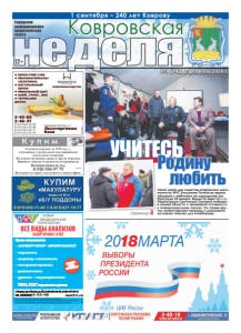 неделя Ковровская Городская информационноаналитическая газета ● ШПОН FINE-LINE ● ПИЛОМАТЕРИАЛЫ (ЭКЗОТИКА) ● НАТУРАЛЬНЫЙ ШПОН ● МЕБЕЛЬНЫЙ ЩИТ ● КЛЕЙ, ГРУНТ, ЛАК ● ТЕРРАСНАЯ ДОСКА Северный проезд, д. 1 Лесоторговая база 2-42-02 2-46-31 8-919-022-02-99 8-919-022-02-88 8-919-022-02-77 8-919-022-02-33 КОМПАНИЯ ВУДСТОК реклама реклама №8 (342) 2 февраля 2018 г. 12+ НОВЫЕ МЕДИЦИНСКИЕ ТЕХНОЛОГИИ Прием специалистов: • АЛЛЕРГОЛОГ-ИММУНОЛОГ • терапевт, • акушер-гинеколог, • гастроэнтеролог, • ревматолог, • уролог • эндокринолог УЗИ, ЭКГ взрослым и детям *Перечень и стоимость анализов уточняйте у администратора при регистрации. Лицензия № ЛО-33-01-001806 от 05.03.15 г. выдана департаментом здравоохранения администрации Владимирской области. ОГРН 1143327006459, ИНН 3327124955. скидки по акции и дисконтным картам не суммируются nmt33.ru ВСЕ ВИДЫ АНАЛИЗОВ ЗАБОР КРОВИ С 0 ЛЕТ АНАЛИЗЫ В ДЕНЬ ОБРАЩЕНИЯ* РЕКЛАМА ИМЕЮТСß ПРОТИВОПОКАЗАНИß. НЕОБÕОДИМА КОНСУЛÜТАÖИß СПЕÖИАЛИСТА г. Ковров, пр-т Ленина, д. 35, 8-930-830-09-57, 8-900-477-55-11 тел. 8(49232) 6-43-48 страница 3 Такой наказ дал кадетам ковровских школ министр МЧС Владимир Пучков во время общения с ребятами на аэродроме Доброграда 26 января. Министр вместе с губернатором Светланой Орловой побывал в нашей области с проверкой готовности к пожароопасному сезону. Он также вручил министерские награды и документы на новую технику для огнеборцев. УЧИТЕСЬРодину любить 1 сентября – 240 лет Коврову реклама