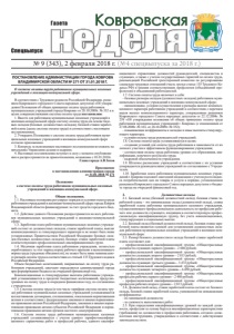 № 9 2 февраля 2018 г. 4 1. Отклонить и направить на доработку проект планировки и межевания территории в районе ул.Чайковского ввиду невозможности заключения соглашения о перераспределении земельных участков :ЗУ8, :ЗУ9, :ЗУ10, :ЗУ11, так как границы земельных участков: дома № 74 по ул. Чайковского (кадастровый № 33:20:015002:38), дома № 76 по ул. Чайковского (кадастровый № 33:20:015002:39), дома № 78 по ул. Чайковского (кадастровый № 33:20:015002:40), дома № 80 по ул. Чайковского (кадастровый № 33:20:015002:41) подлежат уточнению в соответствии с Федеральным законом «О государственной регистрации недвижимости». 2. Контроль за исполнением настоящего постановления оставляю за собой. 3. Настоящее постановление вступает в силу со дня его подписания и подлежит официальному опубликованию. Глава города А.В. Зотов ПОСТАНОВЛЕНИЕ АДМИНИСТРАЦИИ ГОРОДА КОВРОВА ВЛАДИМИРСКОЙ ОБЛАСТИ № 275 ОТ 31.01.2018 Г. О предоставлении разрешения на условно разрешенный вид использования земельного участка. В соответствии с Градостроительным кодексом Российской Федерации № 190-ФЗ от 29.12.2004, заключением № 2/2018 о результатах публичных слушаний, руководствуясь Уставом муниципального образования город Ковров, постановляю: 1. Предоставить разрешение на условно разрешенный вид использования земельного участка, расположенного в зоне жилой застройки средней этажности (5-8 этажей, включая мансардный) Ж- 2 по адресу: Владимирская область, г. Ковров, ул. Войкова, д.11 (кадастровый № 33:20:014815:9), «индивидуальный жилой дом». 2. Контроль за исполнением настоящего постановления оставляю за собой. 3. Настоящее постановление вступает в силу со дня его подписания и подлежит официальному опубликованию. Глава города А.В. Зотов ПОСТАНОВЛЕНИЕ АДМИНИСТРАЦИИ ГОРОДА КОВРОВА ВЛАДИМИРСКОЙ ОБЛАСТИ № 313 ОТ 01.02.2018 Г. О корректировке документации по планировке территории, ограниченной улицами: Тургенева, Лизы Чайкиной, Пушкина, Зои Космодемьянской. В соответствии со статьями 45, 46 Градостроительного кодекса Российской Федерации, главой 5 Правил землепользования и застройки города Коврова, утвержденных решением Совета народных депутатов города Коврова, от 01.12.2011 № 460, на основании заявления Афанасьева А.В. от 11.01.2018 рег. № 23/01-300-17, руководствуясь Уставом муниципального образования город Ковров, постановляю: 1. Организовать работы по корректировке документации по планировке территории, ограниченной улицами: Тургенева, Лизы Чайкиной, Пушкина, Зои Космодемьянской, утвержденной постановлениями администрации г.Коврова от 23.12.2016 № 3783, от 18.05.2017 № 1192, в соответствии с техническим заданием на разработку документации по планировке территории (приложение). 2. Установить, что в течение 10 дней со дня опубликования данного постановления физические и юридические лица вправе представлять свои предложения о порядке, сроках подготовки и содержании документации по планировке территории в управление строительства и архитектуры администрации города Коврова по адресу: 601900, Владимирская обл., г. Ковров, ул. Краснознаменная, д. 6. 3. Контроль за исполнением настоящего постановления оставляю за собой. 4. Настоящее постановление вступает в силу со дня его подписания и подлежит опубликованию. Глава города А.В. Зотов Приложение к постановлению администрации г. Коврова от 01.02.2018 № 313 Техническое задание на корректировку документации по планировке территории, ог