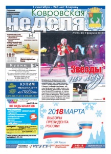 неделя Ковровская Городская информационноаналитическая газета ● ШПОН FINE-LINE ● ПИЛОМАТЕРИАЛЫ (ЭКЗОТИКА) ● НАТУРАЛЬНЫЙ ШПОН ● МЕБЕЛЬНЫЙ ЩИТ ● КЛЕЙ, ГРУНТ, ЛАК ● ТЕРРАСНАЯ ДОСКА Северный проезд, д. 1 Лесоторговая база 2-42-02 2-46-31 8-919-022-02-99 8-919-022-02-88 8-919-022-02-77 8-919-022-02-33 КОМПАНИЯ ВУДСТОК реклама реклама №10 (344) 9 февраля 2018 г. Фото А. Соколова 12+ НОВЫЕ МЕДИЦИНСКИЕ ТЕХНОЛОГИИ Прием специалистов: • АЛЛЕРГОЛОГ-ИММУНОЛОГ • терапевт, • акушер-гинеколог, • гастроэнтеролог, • ревматолог, • уролог • эндокринолог УЗИ, ЭКГ взрослым и детям *Стоимость исследований уточняйте у администра при оформлении. Скидки по дисконтным картам и другим акциям не суммируются. Лицензия № ЛО-33-01-001806 от 05.03.15 г. выдана департаментом здравоохранения администрации Владимирской области. ОГРН 1143327006459, ИНН 3327124955. nmt33.ru ВСЕ ВИДЫ АНАЛИЗОВ АНАЛИЗЫ В ДЕНЬ ОБРАЩЕНИЯ* РЕКЛАМА ÈÌÅÞÒÑß ÏÐÎÒÈÂÎÏÎÊÀÇÀÍÈß. ÍÅÎÁÕÎÄÈÌÀ ÊÎÍÑÓËÜÒÀÖÈß ÑÏÅÖÈÀËÈÑÒÀ г. Ковров, пр-т Ленина, д. 35, 8-930-830-09-57, 8-900-477-55-11 тел. 8(49232) 6-43-48 АКЦИЯ! «ПРОВЕРЬ СВОЁ ЗДОРОВЬЕ» С 10 февраля по 10 марта СКИДКА 70% на комплекс из 10 медицинских анализов: общий анализ крови, СОЭ, общий анализ мочи, АЛАТ, АСАТ, глюкоза, холестерин общий, мочевина, креатинин, общий белок – 350 рублей вместо 1180 руб. (без учета забора крови) ЗАБОР КРОВИ С 0 ЛЕТ страница 14 1 сентября – 240 лет Коврову реклама Впервые на Ковровской земле состоялось изумительное ледовое шоу на открытом воздухе: в Доброграде прошел фестиваль Евгения Плющенко. На лед природного озера вышли живые легенды фигурного катания: сам Евгений Плющенко, а также Аделина Сотникова, Ирина Слуцкая, Сергей Воронов, Юко Кавагути и Александр Смирнов. Восторг многочисленной публики не охладила даже морозная погода. на льду Звезды