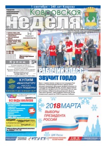6 16 февраля 2018 г. Ковровская неделя №12 Два новых производства Губернатор Светлана Орлова встретилась с полпредом Президента в ЦФО Алексеем Гордеевым. В ходе встречи глава региона рассказала об итогах социально-экономического развития области в прошлом году, подробно отчиталась о выполнении майских указов главы государства. Светлана Орлова сообщила и о ближайших планах. В феврале в Камешкове откроется новый производственный корпус НПО «Вояж». Инвестиции составили 1,4 млрд рублей. С запуском корпуса расширится номенклатура выпускаемой продукции, на рынок выйдут новые товары. Появится около 150 новых рабочих мест. Для города с населением около 13 тыс. человек это значительное подспорье. Кроме того, в конце февраля в Гусь-Хрустальном с запуском нового литейного цеха завода «Гусар» начнется серийное производство трубопроводной арматуры по программе импортозамещения для топливно-энергетического комплекса России. Мощность нового производства составит 7-8 тыс. тонн стали в год. С его открытием на заводе будет создано 400 высокопроизводительных рабочих мест. В новое производство инвестировано около 1,7 млрд рублей, что обеспечит завод высококачественной заготовкой, отвечающей всем мировым стандартам и требованиям для выпуска любых видов запорно-регулирующей арматуры. Капремонт ДК завершился В поселке Малыгино Ковровского района прошло торжественное открытие обновленного Дома культуры. На закупки и ремонтные работы ДК из бюджета затрачено 6,8 млн рублей. В зрительном зале обновлена сцена, заменены кресла, установлено новое современное оборудование, отремонтированы коридоры и фойе, кабинеты для кружковцев. В день открытия в фойе оформили фотовыставку «Живая нить времен». Здесь же организовали мастер-классы по рукоделию. В концертной программе участвовали лучшие творческие коллективы поселка, ансамбль «Владимирские рожечники». За рождение первенца – деньги от государства Жители области начали получать первые выплаты за январских новорожденных. На недавнюю встречу молодых мам с губернатором Светланой Орловой была приглашена жительница Владимира, специалист по социальной работе Валентина Егорова. 11 января у Валентины и Сергея Егоровых родилась дочь. Рождение первого ребенка дало возможность молодой семье стать одной из первых, кто смог реализовать свое право на материальную поддержку. Светлана Орлова тепло поздравила счастливых молодых родителей. Напомним, что с нового года вступил в силу закон, подписанный Президентом страны Владимиром Путиным, о выплатах на первого ребенка тем семьям, в которых среднедушевой доход составляет меньше полутора прожиточного минимума. В нашей области на это пособие могут претендовать семьи, в которых среднедушевой доход на одного человека меньше 15924 рублей в месяц. Размер пособия составляет около 10 тыс. рублей в месяц и будет выплачиваться до достижения ребенком полутора лет. город плюс регион 18 МАРТА – ВЫБОРЫ ПРЕЗИДЕНТА РОССИЙСКОЙ ФЕДЕРАЦИИ введено в эксплуатацию в области в 2017 году, это составляет 106,1% к уровню 2016 года. Построено 8256 новых квартир, большинство из которых обрели своих новоселов, улучшили условия проживания людей. тысячи квадратных метров жилья 695,4 ЦИФРА ДНЯ Хроника избирательной кампании Определен перечень избирательных участков, на которых во время выборов Президе