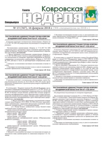 № 13 (347), 16 февраля 2018 г. (№6 спецвыпуска за 2018 г.) ǺDzDZDzǸȌ ǸȜȐȞȜȐȟȘȎȭ Спецвыпуск Газета ПОСТАНОВЛЕНИЕ АДМИНИСТРАЦИИ ГОРОДА КОВРОВА ВЛАДИМИРСКОЙ ОБЛАСТИ № 435 ОТ 14.02.2018 Г. О внесении изменений в постановление администрации г.Коврова от 17.11.2017 № 3290 «Об утверждении документации по планировке территории» Постановлением администрации г.Коврова от 17.11.2017 № 3290 утверждены проект планировки и проект межевания территории микрорайона им.Чкалова. Руководствуясь Уставом муниципального образования город Ковров, постановляю: 1. Внести изменения в постановление администрации г.Коврова от 17.11.2017 № 3290 и пункт 3 читать в следующей редакции: «Установить, что документация по планировке территории микрорайона им.Чкалова, утвержденная постановлением администрации г.Коврова от 14.07.2014 № 1658, действует в части, не противоречащей утверждаемому проекту». 2. Контроль за исполнением настоящего постановления оставляю за собой. 3. Настоящее постановление вступает в силу со дня его подписания и подлежит официальному опубликованию. Глава города А.В. Зотов ПОСТАНОВЛЕНИЕ АДМИНИСТРАЦИИ ГОРОДА КОВРОВА ВЛАДИМИРСКОЙ ОБЛАСТИ № 436 ОТ 14.02.2018 Г. О внесении изменений в постановление администрации города Коврова Владимирской области от 30.12.2010 № 1590 «Об оплате труда работников муниципальных учреждений физкультурно-спортивной направленности» В соответствии с Трудовым кодексом Российской Федерации, постановлением Губернатора Владимирской области от 27.07.2017 № 615 «О внесении изменений в постановление Губернатора области от 08.08.2008 № 562 «О базовых окладах (базовых должностных окладах) профессиональных квалификационных групп общеотраслевых должностей руководителей, специалистов и служащих, базовых ставок заработной платы профессиональных квалификационных групп общеотраслевых профессий рабочих», постановляю: 1. Внести изменения в приложение к постановлению администрации города Коврова от 30.12.2010 г. № 1590 «Об оплате труда работников муниципальных учреждений физкультурно-спортивной направленности», изложив пункт 2.1. в следующей редакции: «2.1. Размер базового должностного оклада, базовой ставки заработной платы составляет для: · профессиональной квалификационной группы должностей работников физической культуры и спорта: - первого уровня – 2681 рублей; - второго уровня – 4064 рубля - третьего уровня – 6733 рубля; · профессиональной квалификационной группы «Общеотраслевые должности служащих»: - первого уровня – 2686 рублей; - второго уровня – 2813 рублей; - третьего уровня – 3472 рублей; · профессиональной квалификационной группы «Общеотраслевые профессии рабочих»: - первого уровня – 2480 рублей; - второго уровня – 2813 рублей». 2. Контроль за исполнением настоящего постановления возложить на заместителя главы администрации по социальным вопросам С.К. Степанову. 3. Настоящее постановление вступает в силу со дня подписания, подлежит официальному опубликованию и распространяется на правоотношения, возникшие с 01 января 2018 года. Глава города А.В.Зотов ПОСТАНОВЛЕНИЕ АДМИНИСТРАЦИИ ГОРОДА КОВРОВА ВЛАДИМИРСКОЙ ОБЛАСТИ № 448 ОТ 14.02.2018 Г. О внесении дополнений в приложение № 2 к постановлению администрации города Коврова от 14.11.2016 № 3400 «Об утверждении результатов государственной кадастровой оценки земель муниципального образования г. Ковров» В соответствии со статьей 66 Земельного кодекса Р