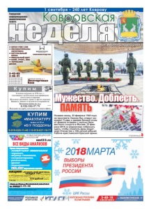 неделя Ковровская Городская информационноаналитическая газета ● ШПОН FINE-LINE ● ПИЛОМАТЕРИАЛЫ (ЭКЗОТИКА) ● НАТУРАЛЬНЫЙ ШПОН ● МЕБЕЛЬНЫЙ ЩИТ ● КЛЕЙ, ГРУНТ, ЛАК ● ТЕРРАСНАЯ ДОСКА Северный проезд, д. 1 Лесоторговая база 2-42-02 2-46-31 8-919-022-02-99 8-919-022-02-88 8-919-022-02-77 8-919-022-02-33 КОМПАНИЯ ВУДСТОК реклама реклама №16 (350) 2 марта 2018 г. 12+ НОВЫЕ МЕДИЦИНСКИЕ ТЕХНОЛОГИИ Прием специалистов: • АЛЛЕРГОЛОГ-ИММУНОЛОГ • терапевт, • акушер-гинеколог, • гастроэнтеролог, • ревматолог, • уролог • эндокринолог УЗИ, ЭКГ взрослым и детям *Стоимость исследований уточняйте у администра при оформлении. Скидки по дисконтным картам и другим акциям не суммируются. Лицензия № ЛО-33-01-001806 от 05.03.15 г. выдана департаментом здравоохранения администрации Владимирской области. ОГРН 1143327006459, ИНН 3327124955. nmt33.ru ВСЕ ВИДЫ АНАЛИЗОВ АНАЛИЗЫ В ДЕНЬ ОБРАЩЕНИЯ* РЕКЛАМА ÈÌÅÞÒÑß ÏÐÎÒÈÂÎÏÎÊÀÇÀÍÈß. ÍÅÎÁÕÎÄÈÌÀ ÊÎÍÑÓËÜÒÀÖÈß ÑÏÅÖÈÀËÈÑÒÀ г. Ковров, пр-т Ленина, д. 35, 8-930-830-09-57, 8-900-477-55-11 тел. 8(49232) 6-43-48 АКЦИЯ! «ПРОВЕРЬ СВОЁ ЗДОРОВЬЕ» С 10 февраля по 10 марта СКИДКА 70% на комплекс из 10 медицинских анализов: общий анализ крови, СОЭ, общий анализ мочи, АЛАТ, АСАТ, глюкоза, холестерин общий, мочевина, креатинин, общий белок – 350 рублей вместо 1180 руб. (без учета забора крови) ЗАБОР КРОВИ С 0 ЛЕТ страница 3 1 сентября – 240 лет Коврову реклама Полвека назад, 23 февраля 1968 года, на проспекте Ленина был открыт монумент Славы и зажжен Вечный огонь от факела пламени с могилы Неизвестного солдата в Москве. 23 февраля 2018-го ковровчане собрались здесь, чтобы отметить День защитника Отечества и 100-летний юбилей Рабоче-крестьянской Красной армии. Мужество. Доблесть. ПАМЯТЬ