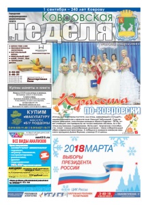 по-ковровски неделя Ковровская Городская информационноаналитическая газета ● ШПОН FINE-LINE ● ПИЛОМАТЕРИАЛЫ (ЭКЗОТИКА) ● НАТУРАЛЬНЫЙ ШПОН ● МЕБЕЛЬНЫЙ ЩИТ ● КЛЕЙ, ГРУНТ, ЛАК ● ТЕРРАСНАЯ ДОСКА Северный проезд, д. 1 Лесоторговая база 2-42-02 2-46-31 8-919-022-02-99 8-919-022-02-88 8-919-022-02-77 8-919-022-02-33 КОМПАНИЯ ВУДСТОК реклама реклама №18 (352) 9 марта 2018 г. Фото И. Волкова 12+ НОВЫЕ МЕДИЦИНСКИЕ ТЕХНОЛОГИИ Прием специалистов: • АЛЛЕРГОЛОГ-ИММУНОЛОГ • терапевт, • акушер-гинеколог, • гастроэнтеролог, • ревматолог, • уролог • эндокринолог УЗИ, ЭКГ взрослым и детям *Стоимость исследований уточняйте у администра при оформлении. Скидки по дисконтным картам и другим акциям не суммируются. Лицензия № ЛО-33-01-001806 от 05.03.15 г. выдана департаментом здравоохранения администрации Владимирской области. ОГРН 1143327006459, ИНН 3327124955. nmt33.ru ВСЕ ВИДЫ АНАЛИЗОВ АНАЛИЗЫ В ДЕНЬ ОБРАЩЕНИЯ* РЕКЛАМА ÈÌÅÞÒÑß ÏÐÎÒÈÂÎÏÎÊÀÇÀÍÈß. ÍÅÎÁÕÎÄÈÌÀ ÊÎÍÑÓËÜÒÀÖÈß ÑÏÅÖÈÀËÈÑÒÀ г. Ковров, пр-т Ленина, д. 35, 8-930-830-09-57, 8-900-477-55-11 тел. 8(49232) 6-43-48 АКЦИЯ! «ПРОВЕРЬ СВОЁ ЗДОРОВЬЕ» С 10 февраля по 1 апреля СКИДКА 70% на комплекс из 10 медицинских анализов: общий анализ крови, СОЭ, общий анализ мочи, АЛАТ, АСАТ, глюкоза, холестерин общий, мочевина, креатинин, общий белок – 350 рублей вместо 1180 руб. (без учета забора крови) ЗАБОР КРОВИ С 0 ЛЕТ 1 сентября – 240 лет Коврову реклама Êðàñîòà «Сосуд она, в котором пустота, или огонь, мерцающий в сосуде?» – задавался вопросом о красоте поэт Николай Заболоцкий. Судя по нашим девушкам, участницам конкурса «Краса Коврова – 2018», ответ очевиден: они прекрасны не только внешним обликом, но и богатым внутренним содержанием. Интеллект, творческие способности, спорт, самые разнообразные увлечения – таков собирательный образ ковровской красавицы. А победила в конкурсе накануне женского праздника Диана Якунина, ученица 21-й школы. страница 15