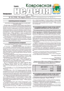 № 24 30 марта 2018 г. 2 3. Утвердить перечень территорий, закрепленных за производственными предприятиями, организациями, и учреждениями, по очистке и уборке улиц, площадей и проездов города (приложение №1), перечень закрепленных территорий за муниципальными учреждениями социальной сферы (приложение №2). 4. Предложить руководителям предприятий, учреждений, организаций всех форм собственности, всем трудоспособным гражданам принять активное участие в субботниках по санитарной уборке, очистке и благоустройству территорий города. 5. Согласно «Правилам благоустройства территории муниципального образования город Ковров Владимирской области», утвержденных Решением Совета народных депутатов города Коврова от 26.07.2017 г. №162, установить следующие границы прилегающих территорий подлежащих уборке и вывозу с этих территорий мусора: 1) территории многоквартирных домов в длину – на протяжении всего земельного участка, на котором располагается дом, включая половину территории разрывов между домами, в ширину – до проезжей части, включая 0,5 метра проезжей части у борта при отсутствии газонов – за УК, ЖСК, ТСЖ и организациями, уполномоченными обслуживать жилищный фонд, либо обслуживающих его по договорам. Обязанность по содержанию территории, образованной границами земельных участков нескольких рядом расположенных многоквартирных домов, возлагается на указанные организации пропорционально площади земельных участков образующих данную территорию; 2) за учреждениями социальной сферы (муниципальные общеобразовательные учреждения, учреждения культуры, здравоохранения, физкультуры и спорта) – территории в границах отведенного земельного участка и прилегающая территория согласно приложению 2; 3) лица, эксплуатирующие встроенные нежилые помещения в многоквартирных жилых домах, осуществляют санитарную очистку земельного участка, выделенного для эксплуатации жилого фонда, пропорционально занимаемым площадям. Участок для санитарной очистки определяется собственниками жилого фонда. В случае размещения нежилого помещения (магазина, офиса и т.д.) на первом этаже многоквартирного жилого дома с отдельным выходом на земельный участок, указанные лица осуществляют санитарную очистку прилегающего земельного участка в длину – от входа в нежилое помещение до проезжей части, в ширину – соразмерно занимаемому нежилому помещению с прилегающей к ней пятиметровой зоной, при этом, если нежилые помещения, расположенные в многоквартирном доме, граничат между собой или расстояние между ними составляет менее 10 метров, ширина санитарной очистки определяется границей их соединения или серединой расстояния между данными нежилыми помещениями; 4) за организациями промышленности, торговли и общественного питания, транспорта, заправочными станциями – территории в границах отведенного земельного участка и прилегающая к ним десятиметровая зона вокруг них; 5) за собственниками частных домовладений – территории в границах выделенного земельного участка, включая территорию до середины улицы, при односторонней застройке – на всю ширину проезжей части и десять метров за ней; 6) за организациями мелкорозничной торговли (палатки, лотки, ларьки, киоски, павильоны, летние кафе и другие объекты временной уличной торговли) – территории отведенного земельного