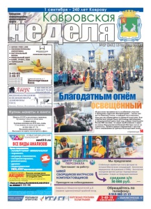 неделя Ковровская Городская информационноаналитическая газета ● ШПОН FINE-LINE ● ПИЛОМАТЕРИАЛЫ (ЭКЗОТИКА) ● НАТУРАЛЬНЫЙ ШПОН ● МЕБЕЛЬНЫЙ ЩИТ ● КЛЕЙ, ГРУНТ, ЛАК ● ТЕРРАСНАЯ ДОСКА Северный проезд, д. 1 Лесоторговая база 2-42-02 2-46-31 8-919-022-02-99 8-919-022-02-88 8-919-022-02-77 8-919-022-02-33 КОМПАНИЯ ВУДСТОК реклама реклама №27 (361) 13 апреля 2018 г. 12+ НОВЫЕ МЕДИЦИНСКИЕ ТЕХНОЛОГИИ Прием специалистов: • АЛЛЕРГОЛОГ-ИММУНОЛОГ • терапевт, • акушер-гинеколог, • гастроэнтеролог, • ревматолог, • уролог • эндокринолог УЗИ, ЭКГ взрослым и детям *Перечень и стоимость анализов уточняйте у администратора при регистрации. Место проведения акции: г. Ковров пр-т Ленина, д. 35 (тел. 6-43-48.) с 1.04.2018 по 1.05.2018. Акцию проводит ООО «Медлайн». Количество призов ограничено. Лицензия № ЛО-33-01-001806 от 05.03.15 г. выдана департаментом здравоохранения администрации Владимирской области. ОГРН 1143327006459, ИНН 3327124955. nmt33.ru ВСЕ ВИДЫ АНАЛИЗОВ АНАЛИЗЫ В ДЕНЬ ОБРАЩЕНИЯ* РЕКЛАМА ÈÌÅÞÒÑß ÏÐÎÒÈÂÎÏÎÊÀÇÀÍÈß. ÍÅÎÁÕÎÄÈÌÀ ÊÎÍÑÓËÜÒÀÖÈß ÑÏÅÖÈÀËÈÑÒÀ г. Ковров, пр-т Ленина, д. 35, 8-930-830-09-57, 8-900-477-55-11 тел. 8(49232) 6-43-48 ЗАБОР КРОВИ С 0 ЛЕТ АКЦИЯ!* с 1 апреля по 1 мая 2018 г. Панели аллергенов производства Германия со скидкой 20%. 20 аллергенов: педиатрическая, респираторная, универсальная, пищевая. 1 сентября – 240 лет Коврову страница 14 реклама реклама «В русском человеке есть особенное участие к празднику Светлого Воскресения», – писал когда-то Николай Гоголь, и каждый год в пасхальные дни мы убеждаемся в правоте классика. Все ковровские храмы были заполнены верующими, а традиционный крестный ход собрал изначально более 500 человек, по мере приближения к церкви иконы Феодоровской Божией Матери число их удвоилось. Православные ковровчане с восторгом и ликованием встречали Благодатный огонь... Благодатным огнём освещённый