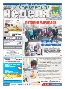 неделя Ковровская Городская информационноаналитическая газета ● ШПОН FINE-LINE ● ПИЛОМАТЕРИАЛЫ (ЭКЗОТИКА) ● НАТУРАЛЬНЫЙ ШПОН ● МЕБЕЛЬНЫЙ ЩИТ ● КЛЕЙ, ГРУНТ, ЛАК ● ТЕРРАСНАЯ ДОСКА Северный проезд, д. 1 Лесоторговая база 2-42-02 2-46-31 8-919-022-02-99 8-919-022-02-88 8-919-022-02-77 8-919-022-02-33 КОМПАНИЯ ВУДСТОК реклама реклама №32 (366) 4 мая 2018 г. 12+ НОВЫЕ МЕДИЦИНСКИЕ ТЕХНОЛОГИИ Прием специалистов: • АЛЛЕРГОЛОГ-ИММУНОЛОГ • терапевт, • акушер-гинеколог, • гастроэнтеролог, • ревматолог, • уролог • эндокринолог УЗИ, ЭКГ взрослым и детям *Перечень и стоимость анализов уточняйте у администратора при регистрации. Место проведения акции: г. Ковров пр-т Ленина, д. 35 (тел. 6-43-48.) с 1.05.2018 по 1.06.2018. Акцию проводит ООО «Медлайн». Скидка по дисконтным картам с другими акциями не суммируется. Лицензия № ЛО-33-01-001806 от 05.03.15 г. выдана департаментом здравоохранения администрации Владимирской области. ОГРН 1143327006459, ИНН 3327124955. nmt33.ru ВСЕ ВИДЫ АНАЛИЗОВ АНАЛИЗЫ В ДЕНЬ ОБРАЩЕНИЯ* РЕКЛАМА ÈÌÅÞÒÑß ÏÐÎÒÈÂÎÏÎÊÀÇÀÍÈß. ÍÅÎÁÕÎÄÈÌÀ ÊÎÍÑÓËÜÒÀÖÈß ÑÏÅÖÈÀËÈÑÒÀ г. Ковров, пр-т Ленина, д. 35, 8-930-830-09-57, 8-900-477-55-11 тел. 8(49232) 6-43-48 ЗАБОР КРОВИ С 0 ЛЕТ скидка с 1 мая по 1 июня 2018 г. на общий анализ крови, СОЭ, общий анализ мочи 50%* страница 14 реклама реклама 1 сентября – 240 лет Коврову Фото А. Соколова В пятницу, 28 апреля, Ковров посетили необычные гости: в город воинской славы прибыли внуки и правнуки маршалов Соколовского, Баграмяна, Чуйкова, Устинова. Визит состоялся благодаря дружеским связям с легендарными семьями, возникшим в ходе проекта «Мы в ответе за нашу Победу! Мы в ответе за нашу страну!» ПОТОМКИ МАРШАЛОВ в городе оружейников