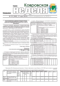 № 35 (369), 11 мая 2018 г. (№16 спецвыпуска за 2018 г.) ǺDzDZDzǸȌ ǸȜȐȞȜȐȟȘȎȭ Спецвыпуск Газета ПОСТАНОВЛЕНИЕ АДМИНИСТРАЦИИ ГОРОДА КОВРОВА ВЛАДИМИРСКОЙ ОБЛАСТИ № 1042 ОТ 04.05.2018 Г. О внесении изменений в приложение к постановлению администрации города Коврова Владимирской области от 25.12.2017 № 3853 «Об утверждении муниципальной программы «Развитие образования в городе Коврове на 2015-2020 годы» В соответствии со статьей 179 Бюджетного кодекса Российской Федерации, постановлением Губернатора Владимирской области от 04.02.2014 № 59 «Об утверждении государственной программы Владимирской области «Развитие образования» на 2014 - 2020 годы»,на основаниирешения Совета народных депутатов города Коврова от 20.12.2017 №303 «О бюджете города Коврова на 2018 год и на плановый период 2019 и 2020 годов», статьи 32 Устава муниципального образования город Ковров Владимирской области постановляю: 1. Внести в приложение к постановлению администрации города Коврова Владимирской области от 25.12.2017 № 3853 «Об утверждении муниципальной программы «Развитие образования в городе Коврове на 2015-2020 годы» изменения согласно приложению к настоящему постановлению. 2. Контроль за исполнением настоящего постановления возложить на заместителя главы администрации города по социальным вопросам. 3. Настоящее постановление вступает в силу со дня его официального опубликования. Глава города А.В.Зотов Приложение к постановлению администрации города Коврова от «04» мая 2018 № 1042 1. В паспорте муниципальной программы «Развитие образования в городе Коврове на 2015-2020 годы» строку «Объем бюджетных ассигнований на реализацию муниципальной программы» изложить в следующей редакции: Объем бюджетных ассигнований на реализацию муниципальной программы Общий объем средств, предусмотренных на реализацию программы, - 8304596,08 тыс. рублей, в том числе из местного бюджета 3159071,35 тыс. рублей, за счет средств областного бюджета 5145524,73 тыс. рублей. Объем средств по годам реализации программы (за счет всех источников): 2015 - 1267992,53 тыс. рублей; 2016 - 1301716,95 тыс. рублей; 2017 – 1400803,10 тыс. рублей; 2018 – 1480770,90 тыс. рублей; 2019 - 1422997,30 тыс. рублей; - 1430315,30 тыс. рублей 2. Строку «Объемы бюджетных ассигнований подпрограммы 1» изложить в следующей редакции: Объемы бюджетных ассигнований подпрограммы 1 Общий объем средств, предусмотренных на реализацию подпрограммы 1 – 8041500,17 тыс. рублей, в том числе из областного бюджета – 5022509,5 тыс. рублей; за счет средств местного бюджета – 3018990,67 тыс. рублей; Объем средств по годам реализации подпрограммы 1 (за счет всех источников): 2015 год – 1213603,72 тыс. рублей; 2016 год – 1264187,85 тыс. рублей; 2017 год – 1364848,10 тыс. рублей; 2018 год – 1436799,90 тыс. рублей; 2019 год – 1381101,30 тыс. рублей; 2020 год – 1380959,30 тыс.рублей. 3. В приложении № 1 к Программе «Сведения о составе и значениях целевых показателей (индикаторов) муниципальной программы»: 3.1 В разделе «Подпрограмма 1 «Развитие дошкольного, общего и дополнительного образования детей»: 3.1.1. Строку 15.1.22 изложить в новой редакции: 15 1 22 Удельный вес детей и подростков, охваченных всеми формами отдыха и оздоровления (к общему числу детей от 7 до 17 лет) % 74 74 74 74,5- - - 3.1.2 Дополнить строкой15.1.37 следующего содержания: 15 1 37 Удельный вес детей школьного возраста, подлежащих отдыху в организациях отдыха и их оздоровления в каникулярный период за счет средств субсидии из областного бюджета бюджетам муниципальны