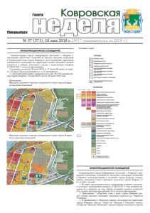 № 37 (371), 18 мая 2018 г. (№17 спецвыпуска за 2018 г.) ǺDzDZDzǸȌ ǸȜȐȞȜȐȟȘȎȭ Спецвыпуск Газета ИНФОРМАЦИОННОЕ СООБЩЕНИЕ Администрация города информирует население г. Коврова о проведении публичных слушаний по проекту внесения изменений в Генеральный план города Коврова в части изменения территории специального назначения на территорию жилой застройки средней этажности в районе земельного участка с кадастровым номером 33:20:011101:1 согласно приложению. Слушания состоятся 24 июля 2018г. в 15 часов 00 минут по адресу: г.Ковров, Краснознаменная ул., д. 6, актовый зал. С документацией можно ознакомиться в каб. № 310 администрации города Коврова с 18 мая 2018 года по 24 июля 2018 года. Приложение Фрагмент основного чертежа генерального плана города Ковров до внесения изменений Фрагмент основного чертежа генерального плана города Ковров после внесения изменений Условные знаки ИНФОРМАЦИОННОЕ СООБЩЕНИЕ Администрация города информирует население г. Коврова о проведении публичных слушаний по внесению следующих изменений в Правила землепользования и застройки города Коврова, утвержденные решением Совета народных депутатов города Коврова от 01.12.2011г. № 460: 1. На карте градостроительного зонирования в районе земельного участка с кадастровым номером 33:20:011101:1 зону военных ведомств В-1 изменить на зону жилой застройки средней этажности (5-8 этажей, включая мансардный) Ж-2 согласно приложению. 2. Приложение 7 «Перечень улиц и дорог города Коврова» раздел «улицы местного значения» дополнить пунктом «ул. Маршала Устинова». 3. В приложении 8 «Перечень парков, лесопарков на территории города Коврова» вместо: «Парк им. Малеева и Кангина» читать: «Сквер им. Малеева и Кангина», указав площадь земельного участка