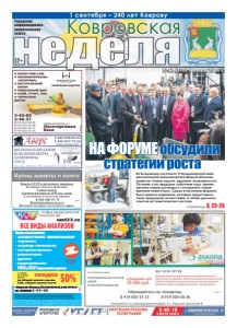 неделя Ковровская Городская информационноаналитическая газета ● ШПОН FINE-LINE ● ПИЛОМАТЕРИАЛЫ (ЭКЗОТИКА) ● НАТУРАЛЬНЫЙ ШПОН ● МЕБЕЛЬНЫЙ ЩИТ ● КЛЕЙ, ГРУНТ, ЛАК ● ТЕРРАСНАЯ ДОСКА Северный проезд, д. 1 Лесоторговая база 2-42-02 2-46-31 8-919-022-02-99 8-919-022-02-88 8-919-022-02-77 8-919-022-02-33 КОМПАНИЯ ВУДСТОК реклама реклама №42 (376) 8 июня 2018 г. 12+ НОВЫЕ МЕДИЦИНСКИЕ ТЕХНОЛОГИИ Прием специалистов: • АЛЛЕРГОЛОГ-ИММУНОЛОГ • терапевт, • акушер-гинеколог, • гастроэнтеролог, • ревматолог, • уролог • эндокринолог УЗИ, ЭКГ взрослым и детям *Перечень и стоимость анализов уточняйте у администратора при регистрации. Место проведения акции: г. Ковров пр т Ленина, д. 35 (тел. 6 43 48.) с 1.06.2018 по 1.07.2018. Акцию проводит ООО «Медлайн». Скидка по дисконтным картам с другими акциями не суммируется. Лицензия № ЛО 33 01 001806 от 05.03.15 г. выдана департаментом здравоохранения администрации Владимирской области. ОГРН 1143327006459, ИНН 3327124955. nmt33.ru ВСЕ ВИДЫ АНАЛИЗОВ АНАЛИЗЫ В ДЕНЬ ОБРАЩЕНИЯ* РЕКЛАМА ÈÌÅÞÒÑß ÏÐÎÒÈÂÎÏÎÊÀÇÀÍÈß. ÍÅÎÁÕÎÄÈÌÀ ÊÎÍÑÓËÜÒÀÖÈß ÑÏÅÖÈÀËÈÑÒÀ г. Ковров, пр-т Ленина, д. 35, 8-930-830-09-57, 8-900-477-55-11 тел. 8(49232) 6-43-48 ЗАБОР КРОВИ С 0 ЛЕТ скидка с 1 июня по 1 июля 2018 г. на общий анализ крови, СОЭ, общий анализ мочи 50%* страницы 3, 22-23 реклама реклама 1 сентября – 240 лет Коврову Во Владимире состоялся VI Владимирский межрегиональный экономический форум «Регионы развития. Новые задачи, решения, возможности». Он вновь стал ведущим событием года, принес региону новые договоры и соглашения, новые крупные инвестиции. Среди участников форума было немало ковровчан, которые представили свою продукцию на выставке, а также делились опытом на тематических сессиях. НА ФОРУМЕ обсудили стратегии роста