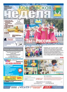 неделя Ковровская Городская информационноаналитическая газета ● ШПОН FINE-LINE ● ПИЛОМАТЕРИАЛЫ (ЭКЗОТИКА) ● НАТУРАЛЬНЫЙ ШПОН ● МЕБЕЛЬНЫЙ ЩИТ ● КЛЕЙ, ГРУНТ, ЛАК ● ТЕРРАСНАЯ ДОСКА Северный проезд, д. 1 Лесоторговая база 2-42-02 2-46-31 8-919-022-02-99 8-919-022-02-88 8-919-022-02-77 8-919-022-02-33 КОМПАНИЯ ВУДСТОК реклама реклама №44 (378) 15 июня 2018 г. 12+ НОВЫЕ МЕДИЦИНСКИЕ ТЕХНОЛОГИИ Прием специалистов: • АЛЛЕРГОЛОГ-ИММУНОЛОГ • терапевт, • акушер-гинеколог, • гастроэнтеролог, • ревматолог, • уролог • эндокринолог УЗИ, ЭКГ взрослым и детям *Перечень и стоимость анализов уточняйте у администратора при регистрации. Место проведения акции: г. Ковров пр-т Ленина, д. 35 (тел. 6-43-48.) с 1.06.2018 по 1.07.2018. Акцию проводит ООО «Медлайн». Скидка по дисконтным картам с другими акциями не суммируется. Лицензия № ЛО-33-01-001806 от 05.03.15 г. выдана департаментом здравоохранения администрации Владимирской области. ОГРН 1143327006459, ИНН 3327124955. nmt33.ru ВСЕ ВИДЫ АНАЛИЗОВ АНАЛИЗЫ В ДЕНЬ ОБРАЩЕНИЯ* РЕКЛАМА ÈÌÅÞÒÑß ÏÐÎÒÈÂÎÏÎÊÀÇÀÍÈß. ÍÅÎÁÕÎÄÈÌÀ ÊÎÍÑÓËÜÒÀÖÈß ÑÏÅÖÈÀËÈÑÒÀ г. Ковров, пр-т Ленина, д. 35, 8-930-830-09-57, 8-900-477-55-11 тел. 8(49232) 6-43-48 ЗАБОР КРОВИ С 0 ЛЕТ скидка с 1 июня по 1 июля 2018 г. на общий анализ крови, СОЭ, общий анализ мочи 50%* страницы 14-15 реклама реклама 1 сентября – 240 лет Коврову Фото И. Волкова В Коврове, как и во всей стране, 12 июня торжественно отметили один из самых молодых государственных праздников – День России. В различных районах города состоялись массовые мероприятия, которые посетили около двух с половиной тысяч ковровчан. Центром торжества стала площадь 200-летия города Коврова. Ты – Россия, ðîäíàÿ, çàâåòíàÿ…