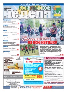 неделя Ковровская Городская информационноаналитическая газета №50 (384) 6 июля 2018 г. 12+ страницы 14-15 1 сентября – 240 лет Коврову ● ШПОН FINE-LINE ● ПИЛОМАТЕРИАЛЫ (ЭКЗОТИКА) ● НАТУРАЛЬНЫЙ ШПОН ● МЕБЕЛЬНЫЙ ЩИТ ● КЛЕЙ, ГРУНТ, ЛАК ● ТЕРРАСНАЯ ДОСКА Северный проезд, д. 1 Лесоторговая база 2-42-02 2-46-31 8-919-022-02-99 8-919-022-02-88 8-919-022-02-77 8-919-022-02-33 КОМПАНИЯ ВУДСТОК реклама реклама НОВЫЕ МЕДИЦИНСКИЕ ТЕХНОЛОГИИ Прием специалистов: • АЛЛЕРГОЛОГ-ИММУНОЛОГ кандидаты медицинских наук из г. Владимира и г. Иваново • терапевт, • акушер-гинеколог, • гастроэнтеролог, • ревматолог, • уролог • эндокринолог УЗИ, ЭКГ взрослым и детям *Перечень и стоимость анализов уточняйте у администратора при регистрации. Место проведения акции: г. Ковров пр-т Ленина, д. 35 (тел. 6-43-48.) с 1.07.2018 по 1.08.2018. Акцию проводит ООО «Медлайн». Скидка по дисконтным картам с другими акциями не суммируется. Лицензия № ЛО-33-01-001806 от 05.03.15 г. выдана департаментом здравоохранения администрации Владимирской области. ОГРН 1143327006459, ИНН 3327124955. nmt33.ru ВСЕ ВИДЫ АНАЛИЗОВ АНАЛИЗЫ В ДЕНЬ ОБРАЩЕНИЯ* РЕКЛАМА ИÌÅÞТСß ÏÐОТИВОÏОÊÀÇÀНИß. НÅОÁÕОÄИÌÀ ÊОНСÓËÜТÀÖИß СÏÅÖИÀËИСТÀ г. Ковров, пр-т Ленина, д. 35, 8-930-830-09-57, 8-900-477-55-11 тел. 8(49232) 6-43-48 ЗАБОР КРОВИ С 0 ЛЕТ скидка с 1 июля по 1 августа 2018 г. на колпоскопию 50%* Фееричный, яркий и позитивный День молодёжи прошёл в Коврове в минувшую субботу. Праздничная программа, которая с утра до вечера длилась в парке им. Дегтярёва, была свёрстана, исходя из предложений самих молодых людей. Неудивительно поэтому, что в мероприятиях приняли участие более 11 тысяч ковровчан. ðåêëàìà Понедельник Четверг страница 5 Воскресенье страница 16 Суббота страница 15 Пятница страница 6 страница 22 страница 4 Среда Вторник страница 3 Âåñåëèëèñü на всю катушку Глава без галстука. Анатолий Зотов – в «Невзрослых новостях» Кадровый вопрос. Бизнесу предложили опекать колледжи Потребитель: в борьбе отстоим мы право своё! Новости региона: пахать надо уметь! Внутренний туризм. Ковров показали владимирцам Старшее поколение. Им спортивная форма – к лицу! Накануне Дня семьи: портрет современной Февронии