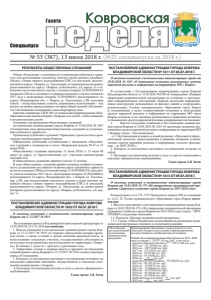 № 53 (387), 13 июля 2018 г. (№25 спецвыпуска за 2018 г.) ǺDzDZDzǸȌ ǸȜȐȞȜȐȟȘȎȭ Спецвыпуск Газета РЕЗУЛЬТАТЫ ОБЩЕСТВЕННЫХ СЛУШАНИЙ Объект обсуждения: о возможности установления публичного сервитута для использования земельного участка в целях ремонта линейного объекта «Линия горячего водоснабжения (ГВС) от котельной, расположенной по адресу: г.Ковров, ул. Текстильная, до здания школы интерната, расположенного по адресу: г.Ковров, ул.Белинского, д.8, корпус 1» в отношении части земельного участка с учетным номером 33:20:010604:4/2 площадью 248 кв.м, входящего в границы земельного участка площадью 2917 кв.м с кадастровым номером 33:20:010604:4 расположенного по адресу: Владимирская обл., г. Ковров, ул. Текстильная, д.2В, категория земель – земли населенных пунктов, разрешенное использование – под жилую застройку, принадлежащего на праве общей долевой собственности собственникам помещений в многоквартирном доме. Заказчик, инициатор: ГКОУ ВО «Специальная (коррекционная) общеобразовательная школа-интернат г.Коврова для глухих, слабослышащих и позднооглохших детей» Основание для проведения общественных слушаний: постановление администрации города Коврова от 19.06.2018 № 1467 «О назначении даты проведения общественных слушаний по установлению публичного сервитута». Организатор публичных слушаний: Управление строительства и архитектуры администрации города Коврова. Официальная публикация постановления о проведении общественных слушаний в спецвыпуске к газете «Ковровская неделя» № 47 от 22 июня 2018г. Общественные слушания проведены 11 июля 2018г. в 15 часов 00 минут по адресу: ул. Краснознаменная, д.6 - городская администрация (актовый зал). В общественных слушаниях приняли участие 12 человек. В ходе общественных слушаний принято решение одобрить возможность установления постоянного безвозмездного публичного сервитута на часть площадью 248 кв.м (учетный номер 33:20:010604:4/2) земельного участка площадью 2917 кв.м с кадастровым номером 33:20:010604:4, расположенного по адресу: Владимирская обл., г. Ковров, ул. Текстильная, д.2В, для использования земельного участка в целях ремонта линейного объекта «Линия горячего водоснабжения (ГВС) от котельной, расположенной по адресу: г.Ковров, ул. Текстильная, до здания школы интерната, расположенного по адресу: г.Ковров, ул.Белинского, д.8, корпус 1». ПОСТАНОВЛЕНИЕ АДМИНИСТРАЦИИ ГОРОДА КОВРОВА ВЛАДИМИРСКОЙ ОБЛАСТИ № 1602 ОТ 06.07.2018 Г. О внесении изменений в постановление администрации города Коврова от 27.12.2017 № 3914 На основании протеста Владимирской транспортной прокуратуры от 25.05.2018 № 23/1-23-2018 постановляю: 1. Внести изменения в постановление администрации города Коврова от 27.12.2017 № 3914 «О порядке определения размера арендной платы, а также условий и сроков внесения арендной платы, за использование земельных участков, государственная собственность на которые не разграничена, расположенных на территории г. Коврова». В таблице 1 пункт 6.1. признать утратившим силу. 2. Управлению делами и кадрами внести в оригинал постановления администрации города Коврова от 27.12.2017 № 3914 соответствующую запись об изменениях. 3. Контроль за исполнением настоящего постановления возложить на начальника управления экономики, имущественных и земельных отношений администрации г. Коврова. 4. Настоящее постановление вступает в силу со дня его официального опубликования. Глава горо