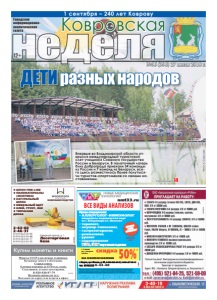 неделя Ковровская Городская информационноаналитическая газета 12+ страница 14 1 сентября – 240 лет Коврову Фото А. Соколова ● ШПОН FINE-LINE ● ПИЛОМАТЕРИАЛЫ (ЭКЗОТИКА) ● НАТУРАЛЬНЫЙ ШПОН ● МЕБЕЛЬНЫЙ ЩИТ ● КЛЕЙ, ГРУНТ, ЛАК ● ТЕРРАСНАЯ ДОСКА Северный проезд, д. 1 Лесоторговая база 2-42-02 2-46-31 8-919-022-02-99 8-919-022-02-88 8-919-022-02-77 8-919-022-02-33 КОМПАНИЯ ВУДСТОК реклама реклама НОВЫЕ МЕДИЦИНСКИЕ ТЕХНОЛОГИИ Прием специалистов: • АЛЛЕРГОЛОГ-ИММУНОЛОГ кандидаты медицинских наук из г. Владимира и г. Иваново • терапевт, • акушер-гинеколог, • гастроэнтеролог, • ревматолог, • уролог • эндокринолог УЗИ, ЭКГ взрослым и детям *Перечень и стоимость анализов уточняйте у администратора при регистрации. Место проведения акции: г. Ковров пр-т Ленина, д. 35 (тел. 6-43-48.) с 1.07.2018 по 1.08.2018. Акцию проводит ООО «Медлайн». Скидка по дисконтным картам с другими акциями не суммируется. Лицензия № ЛО-33-01-001806 от 05.03.15 г. выдана департаментом здравоохранения администрации Владимирской области. ОГРН 1143327006459, ИНН 3327124955. nmt33.ru ВСЕ ВИДЫ АНАЛИЗОВ АНАЛИЗЫ В ДЕНЬ ОБРАЩЕНИЯ* РЕКЛАМА ÈÌÅÞÒÑß ÏÐÎÒÈÂÎÏÎÊÀÇÀÍÈß. ÍÅÎÁÕÎÄÈÌÀ ÊÎÍÑÓËÜÒÀÖÈß ÑÏÅÖÈÀËÈÑÒÀ г. Ковров, пр-т Ленина, д. 35, 8-930-830-09-57, 8-900-477-55-11 тел. 8(49232) 6-43-48 ЗАБОР КРОВИ С 0 ЛЕТ скидка с 1 июля по 1 августа 2018 г. на колпоскопию 50%* ðåêëàìà №56 (390) 27 июля 2018 г. ДЕТИ разных народов Впервые во Владимирской области открылся международный туристский слет учащихся Союзного государства России и Беларуси. В палаточный лагерь близ Доброграда приехали 34 команды из России и 7 команд из Беларуси, всего здесь разместилось более полутысячи туристов-спортсменов со своими наставниками.