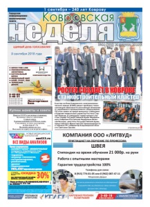 неделя Ковровская Городская информационноаналитическая газета 12+ страница 3 1 сентября – 240 лет Коврову ● ШПОН FINE-LINE ● ПИЛОМАТЕРИАЛЫ (ЭКЗОТИКА) ● НАТУРАЛЬНЫЙ ШПОН ● МЕБЕЛЬНЫЙ ЩИТ ● КЛЕЙ, ГРУНТ, ЛАК ● ТЕРРАСНАЯ ДОСКА Северный проезд, д. 1 Лесоторговая база 2-42-02 2-46-31 8-919-022-02-99 8-919-022-02-88 8-919-022-02-77 8-919-022-02-33 КОМПАНИЯ ВУДСТОК реклама реклама НОВЫЕ МЕДИЦИНСКИЕ ТЕХНОЛОГИИ Прием специалистов: • АЛЛЕРГОЛОГ-ИММУНОЛОГ кандидаты медицинских наук из г. Владимира и г. Иваново • терапевт, • акушер-гинеколог, • гастроэнтеролог, • ревматолог, • уролог • эндокринолог УЗИ, ЭКГ взрослым и детям *Перечень и стоимость анализов уточняйте у администратора при регистрации. Место проведения акции: г. Ковров пр-т Ленина, д. 35 (тел. 6-43-48.) с 1.08.2018 по 1.09.2018. Акцию проводит ООО «Медлайн». Скидка по дисконтным картам с другими акциями не суммируется. Лицензия № ЛО-33-01-001806 от 05.03.15 г. выдана департаментом здравоохранения администрации Владимирской области. ОГРН 1143327006459, ИНН 3327124955. nmt33.ru ВСЕ ВИДЫ АНАЛИЗОВ АНАЛИЗЫ В ДЕНЬ ОБРАЩЕНИЯ* РЕКЛАМА ÈÌÅÞÒÑß ÏÐÎÒÈÂÎÏÎÊÀÇÀÍÈß. ÍÅÎÁÕÎÄÈÌÀ ÊÎÍÑÓËÜÒÀÖÈß ÑÏÅÖÈÀËÈÑÒÀ г. Ковров, пр-т Ленина, д. 35, 8-930-830-09-57, 8-900-477-55-11 тел. 8(49232) 6-43-48 ЗАБОР КРОВИ С 0 ЛЕТ скидка с 1 августа по 1 сентября 2018 г. НА ПЕРВИЧНЫЙ ПРИЁМ ВРАЧА-АЛЛЕРГОЛОГА 30%* №64 (398) 24 августа 2018 г. КОМПАНИЯ ООО «ЛИТВУД» ПРИГЛАШАЕТ НА ОБУЧЕНИЕ ПО ПРОФЕССИИ: ШВЕЯ Стипендия на время обучения 21 000р. на руки Работа с опытными мастерами Гарантия трудоустройства 100% Телефоны для связи: 8 (915) 774-01-05 или 8 (962) 087-47-11 Морозова Дарья реклама Не смогли дозвониться и записаться на собеседование? Скидывайте СМС, мы обязательно с Вами свяжемся. Доступен Viber, WhatsApp. Кластер на базе Ковровского электромеханического завода (КЭМЗ) решит проблему технологической зависимости российской экономики от зарубежного промышленного оборудования. Об этом заявил во время выездного совещания в Коврове генеральный директор Ростеха Сергей Чемезов. В совещании также приняли участие спикер Государственной Думы Федерального Собрания Российской Федерации Вячеслав Володин, депутаты Государственной Думы, представители Министерства промышленности и торговли РФ, губернатор Владимирской области Светлана Орлова. РОСТЕХ СОЗДАЁТ В КОВРОВЕ станкостроительный кластер