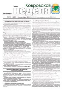 № 71 (405), 14 сентября 2018 г. (№34 спецвыпуска за 2018 г.) ǺDzDZDzǸȌ ǸȜȐȞȜȐȟȘȎȭ Спецвыпуск Газета ОПОВЕЩЕНИЕ О НАЧАЛЕ ПУБЛИЧНЫХ СЛУШАНИЙ Администрация города информирует население г. Коврова о проведении публичных слушаний по проекту: 2. Проект решения о предоставлении разрешения на условно разрешенный вид использования земельного участка «гаражи и автостоянки постоянного хранения машин», расположенного в зоне предприятий пищевой промышленности П-3, по адресу: Владимирская область, МО городской округ г. Ковров, г. Ковров, ул. Володарского, д. 96, (кадастровый № 33:20:011805:50). Информационные материалы к проекту – предпроектная документация на реконструкцию индивидуального жилого дома, разработанная ИП Харитонова 3. Проект решения о предоставлении разрешения на отклонение от предельных параметров разрешенного строительства, расположенного в территориальной зоне предприятий IV класса вредности П-2, по адресу: Владимирская область, МО городской округ г. Ковров, г. Ковров, ул. Волго-Донская, д. 33, корпус 3 (кадастровый № 33:20:013601:13). Информационные материалы к проекту – проектная документация на реконструкцию индивидуального жилого дома, разработанная ООО «Производственная фирма ЭСТэх». Дата начала публичных слушаний: 14 сентября 2018г. Дата окончания публичных слушаний: 27 сентября 2018г. Информационные материалы по проектам размещены на официальном сайте администрации г.Коврова kovrov-gorod.ru в разделе «градостроительная деятельность», подраздел «проекты, рассматриваемые на публичных слушаниях» с 14 сентября 2018г. по 27 сентября 2018г. Экспозиции проектов проводятся по адресу: г. Ковров, Краснознаменная ул., д. 6 (администрация города Коврова), каб. 310 с 14 сентября 2018г. по 27 сентября 2018г. Часы работы экспозиции: в рабочие дни с 08:00 до 17:00. На выставке проводятся консультации по теме публичных слушаний. Собрания участников публичных слушаний состоятся 25 сентября 2018г. по адресу: г. Ковров, Краснознаменная ул., д.6, актовый зал: проект № 2 - в 15:05, проект № 3 - в 15:10 Время регистрации участников – с 14:30 до 15:00. В период с 14 сентября 2018г. по 27 сентября 2018г. участники публичных слушаний имеют право вносить предложения и замечания, касающиеся проектов, подлежащих рассмотрению: - в письменной форме в Комиссию по землепользованию и застройке города Коврова; - посредством записи в книге (журнале) учета посетителей экспозиции проекта, подлежащего рассмотрению на публичных слушаниях; - в письменной или устной форме в ходе проведения собрания участников публичных слушаний. Почтовый адрес Комиссии по землепользованию и застройке города Коврова: г.Ковров, Краснознаменная ул., д. 6 Номера контактных справочных телефонов: (49232) 6-34-68; 3-09-66 ПРАВИЛА СОДЕРЖАНИЯ И ЭКСПЛУАТАЦИИ ПОЖАРНЫХ ГИДРАНТОВ 1. Основные понятия. Противопожарное водоснабжение (ППВ) – комплекс инженерно-технических сооружений, предназначенных для забора и транспортировки воды, хранения ее запасов и использования для целей пожаротушения; Пожарный гидрант- устройство на водопроводной сети, предназначенное для отбора воды при тушении пожаров. Район оперативного обслуживания – территория города Коврова, на которой силами Государственной противопожарной службы (далее – ГПС) организуется тушение пожаров. 2. Содержание и эксплуатация источников ППВ Содержание и эксплуатация пожарных гидрантов включает в себя комплекс орга