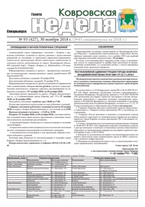 № 93 (427), 30 ноября 2018 г. (№45 спецвыпуска за 2018 г.) ǺDzDZDzǸȌ ǸȜȐȞȜȐȟȘȎȭ Спецвыпуск Газета ОПОВЕЩЕНИЕ О НАЧАЛЕ ПУБЛИЧНЫХ СЛУШАНИЙ Администрация города информирует население г. Коврова о проведении публичных слушаний по проекту решения о предоставлении разрешения на отклонение от предельных параметров разрешенного строительства, реконструкции объекта капитального строительства на земельном участке, расположенном по адресу: Владимирская область, МО городской округ г. Ковров, г.Ковров, ул. Добролюбова, д.10 (кадастровый № 33:20:010501:604). Информационные материалы к проекту – предпроектная документация на реконструкцию административного здания, разработанная ИП Харитоновой О.В. Дата начала публичных слушаний: 30 ноября 2018г. Дата окончания публичных слушаний: 28 декабря 2018г. Информационные материалы по проекту размещены на официальном сайте администрации г.Коврова kovrov-gorod.ru в разделе «градостроительная деятельность», подраздел «проекты, рассматриваемые на публичных слушаниях» с 07 декабря 2018г. по 20 декабря 2018г. Экспозиция проекта проводится по адресу: г.Ковров, Краснознаменная ул., д. 6 (администрация города Коврова), каб. 310 с 07 декабря 2018г. по 18 декабря 2018г. Часы работы экспозиции: в рабочие дни с 08:00 до 17:00. На выставке проводятся консультации по теме публичных слушаний. Собрание участников публичных слушаний состоится 18 декабря 2018г. по адресу: г.Ковров, Краснознаменная ул., д.6, актовый зал в 15:00. Время регистрации участников – с 14:30 до 15:00. В период с 07 декабря 2018г. по 20 декабря 2018г. участники публичных слушаний имеют право вносить предложения и замечания, касающиеся проектов, подлежащих рассмотрению: - в письменной форме в Комиссию по землепользованию и застройке города Коврова; - посредством записи в книге (журнале) учета посетителей экспозиции проекта, подлежащего рассмотрению на публичных слушаниях; - в письменной или устной форме в ходе проведения собрания участников публичных слушаний. Почтовый адрес Комиссии по землепользованию и застройке города Коврова: г.Ковров, Краснознаменная ул., д. 6 Номера контактных справочных телефонов: (49232) 3-25-46; 3-0966 ОБЪЯВЛЕНИЕ Гарантирующий поставщик электроэнергии во Владимирской области Общество с ограниченной ответственностью «Энергосбыт Волга» обращает внимание своих клиентов, что в декабре 2018 года крайний срок передачи показаний электросчетчика - 24 декабря. В случае, если показания будут переданы позже, плата за потребленные услуги по электроэнергии за декабрь будет рассчитана по среднемесячному потреблению, а в следующем месяце, с учетом переданных показаний, будет произведен перерасчет. ПОСТАНОВЛЕНИЕ АДМИНИСТРАЦИИ ГОРОДА КОВРОВА ВЛАДИМИРСКОЙ ОБЛАСТИ № 2887 ОТ 23.11.2018 Г. Об утверждении перечня остановочных пунктов и реестра начальных и конечных остановочных пунктов общественного транспорта по муниципальным маршрутам регулярных перевозок города Коврова (новая редакция) В соответствии со ст.16 Федерального закона РФ от 06.10.2003 №131ФЗ «Об общих принципах организации местного самоуправления в Российской Федерации», Федеральным законом от 13.07.2015 №220-ФЗ «Об организации регулярных перевозок пассажиров и багажа автомобильным транспортом и городским наземным электрическим транспортом в Российской Федерации и о внесении изменений в отдельные законодательные акты Российской Федерации», согласно ст.