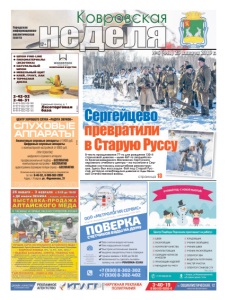 неделя Ковровская Городская информационноаналитическая газета 12+ Àíàëîãîâûå ñëóõîâûå àïïàðàòû îò 5400 ðóá. Öèôðîâûå ñëóõîâûå àïïàðàòû ñ êîìïüþòåðíîé íàñòðîéêîé îò 9000 ðóá. Î ÏÐÎÒÈÂÎÏÎÊÀÇÀÍÈßÕ ÏÐÎÊÎÍÑÓËÜÒÈÐÓÉÒÅÑÜ ÑÎ ÑÏÅÖÈÀËÈÑÒÎÌ ÖÅÍÒÐ ÕÎÐÎØÅÃÎ ÑËÓÕÀ «ÐÀÄÓÃÀ ÇÂÓÊλ ÑËÓÕÎÂÛÅ ÀÏÏÀÐÀÒÛ Âîçìîæåí âûåçä íà äîì. Êîíñóëüòàöèÿ ñî ñïåöèàëèñòîì ïî òåë. 6-46-52, 8-906-562-2992 Àäðåñ: ã. Êîâðîâ, óë. Ôóðìàíîâà, 31 ÏÐÈ ÏÎÊÓÏÊÅ öèôðîâîãî ñëóõîâîãî àïïàðàòà: ïðîôåññèîíàëüíûé ïîäáîð – ÁÅÑÏËÀÒÍÎ êîìïüþòåðíàÿ íàñòðîéêà – ÁÅÑÏËÀÒÍÎ àóäèîãðàììà (ïðîâåðêà ïîòåðè ñëóõà) – ÁÅÑÏËÀÒÍÎ ðåêëàìà ООО «МЕТРОЛОГИЯ СЕРВИС» Аттестат аккредитации No RA.RU. 310649 выдан 27.04.2015 ПОВЕРКА СЧЕТЧИКОВ ВОДЫ НА ДОМУ без снятия водосчетчика без нарушения пломб быстрое исполнение заказа выдача свидетельства о поверке прием заявок с 8.00 до 18.30 возможность сделать онлайнзаявку на сайте POVERKA-33.RU +7 (930) 8-302-302 +7 (930) 8-302-402 В случае непригодности счетчика, оплата за поверку НЕ взимается реклама №6 (441) 25 января 2019 г. ● ШПОН FINE-LINE ● ПИЛОМАТЕРИАЛЫ (ЭКЗОТИКА) ● НАТУРАЛЬНЫЙ ШПОН ● МЕБЕЛЬНЫЙ ЩИТ ● КЛЕЙ, ГРУНТ, ЛАК ● ТЕРРАСНАЯ ДОСКА Северный проезд, д. 1 Лесоторговая база 2-42-02 2-46-31 8-919-022-02-99 8-919-022-02-88 8-919-022-02-77 8-919-022-02-33 КОМПАНИЯ ВУДСТОК реклама Фото И. Волкова страница 13 Сергейцево превратили в Старую Руссу В честь празднования 77-го дня рождения 130-й стрелковой дивизии – ныне 467-го гвардейского Краснознаменного Московско-Тартуского окружного учебного центра – на полигоне в Сергейцеве состоялась масштабная реконструкция. Здесь был воссоздан бой под Старой Руссой, которую освобождала дивизия в годы Великой Отечественной войны. реклама