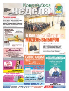 неделя Ковровская Городская информационноаналитическая газета 12+ свежие новости, рассказы о земляках, актуальные темы, культурная и спортивная жизнь, официальная информация, афиша, объявления, сканворд и немного юмора. Читайте в номере: Читайте нашу газету на сайте kovrov-gorod.ru реклама №8 (443) 1 февраля 2019 г. ● ШПОН FINE-LINE ● ПИЛОМАТЕРИАЛЫ (ЭКЗОТИКА) ● НАТУРАЛЬНЫЙ ШПОН ● МЕБЕЛЬНЫЙ ЩИТ ● КЛЕЙ, ГРУНТ, ЛАК ● ТЕРРАСНАЯ ДОСКА Северный проезд, д. 1 Лесоторговая база 2-42-02 2-46-31 8-919-022-02-99 8-919-022-02-88 8-919-022-02-77 8-919-022-02-33 КОМПАНИЯ ВУДСТОК реклама SALE до 50% Норковая шуба от 1700 руб/мес* При покупке шубы, норковая шапка в подарок Меняем старую шубу на новую *Рассрочка без первоначального взноса и переплаты до 3-х лет, на весь ассортимент товара. Подробности у продавцов консультантов. Банки-партнеры:ОАО" Альфа-Банк", лицензия ЦБ РФ № 1326, ООО "Ренессанс Кредит", лицензия ЦБ РФ № 3354, ПАО "Почта Банк", лицензия ЦБ РФ № 650, АО "ОТП Банк", лицензия ЦБ РФ № 2766. ПРЕДЪЯВИТЕЛЮ КУПОНА ДОПОЛНИТЕЛЬНАЯ СКИДКА 1500 РУБ. Выставка-распродажа меха г.Киров 9-10 февраля ДК им. В.И. Ленина (ул. Лопатина д. 4) реклама Ул. Волго-Донская, д. 2/1 (рядом ВНИИ «Сигнал») Тел. +7(904) 593-58-57 Вас порадует приятная атмосфера и доступные цены. ПРЕДЛАГАЕМ ногтевой сервис, стрижки женские, мужские, детские, окрашивание волос, вечерние и свадебные прически. реклама ПРИГЛАШАЕМ ПОСЕТИТЬ НАШУ СТУДИЮ КРАСОТЫ Магнолия 8 (49232) 3-86-52 8 (904) 260-79-96 ПОВЕРКА СЧЕТЧИКОВ ВОДЫ И ГАЗА ИП Петрова Ю.Г. Аттестат аккредитации № RA.RU.320031 от 28.04.2017 В случае непригодности счетчика оплата за поверку не взимается ВЫБЕРИТЕ УДОБНОЕ ДЛЯ ВАС ВРЕМЯ реклама НА ДОМУ, БЕЗ СНЯТИЯ, БЕЗ НАРУШЕНИЯ ПЛОМБ Работаем с 8.00 до 21.00 без обеда и выходных Ковровского электромеханического завода, ОАО «ЗиД», а также других предприятий. ДОРОГО реклама КУПЛЮ АКЦИИ 8-967-059-04-29 Выбирать в сентябре нового главу города всенародно или нанимать по контракту? Этот вопрос обсуждали депутаты ЗС и горсовета, представители предприятий, бизнеса, общественности на совещании в администрации, которое состоялось в среду, 30 января. Фото А.Соколова В Коврове обсудили МОДЕЛЬ ВЫБОРОВ страница 3 реклама