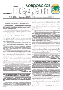 № 9 (444), 1 февраля 2019 г. (№4 спецвыпуска за 2019 г.) ǺDzDZDzǸȌ ǸȜȐȞȜȐȟȘȎȭ Спецвыпуск Газета ПОСТАНОВЛЕНИЕ АДМИНИСТРАЦИИ ГОРОДА КОВРОВА ВЛАДИМИРСКОЙ ОБЛАСТИ № 128 ОТ 28.01.2019 Г. О внесении изменений в постановление администрации города Коврова Владимирской области от 05.10.2015 № 2496 «Об оплате труда работников муниципальных учреждений отдыха и общего оздоровления детей и подростков» В соответствии с Трудовым кодексом Российской Федерации, в целях реализации постановления Губернатора Владимирской области от 24.12.2018 № 544 «О внесении изменений в постановление Губернатора области от 30.07.2008 № 544» и на основании Устава муниципального образования город Ковров Владимирской области постановляю: 1. Внести в приложение к постановлению администрации города Коврова Владимирской области от 05.10.2015 № 2496 «Об оплате труда работников муниципальных учреждений отдыха и общего оздоровления детей и подростков» следующие изменения: 1.1. Подпункты 2.2.1., 2.2.2. пункта 2.2. раздела 2 «Должностной оклад» Положения о системе оплаты труда работников муниципальных учреждений отдыха и общего оздоровления детей и подростков изложить в следующей редакции: «2.2.1. Учебно-вспомогательного персонала первого уровня - 2807 руб. 2.2.2. Учебно-вспомогательного персонала второго уровня - 3260 руб.». 1.2. Пункт 5.1. раздела 5 «Оплата труда руководителей учреждений» Положения о системе оплаты труда работников муниципальных учреждений отдыха и общего оздоровления детей и подростков изложить в следующей редакции: «5.1. На руководителей учреждений распространяется система оплаты труда, размеры и виды выплат компенсационного характера, установленные настоящим Положением в пределах средств фонда оплаты труда. Конкретный размер стимулирующих выплат руководителю устанавливается учредителем (с учетом результатов деятельности учреждения) на финансовый год в размере не более 150 процентов от должностного оклада руководителя.». 1.3. Пункт 5.2. раздела 5 «Оплата труда руководителей учреждений» Положения о системе оплаты труда работников муниципальных учреждений отдыха и общего оздоровления детей и подростков изложить в следующей редакции: «5.2. Должностной оклад руководителей учреждений, определяемый трудовым договором, устанавливается в кратном отношении к средней заработной плате работников возглавляемых ими учреждений и составляет 2 размера указанной средней заработной платы.». 2. Контроль за исполнением настоящего постановления возложить на заместителя главы администрации города по социальным вопросам. 3. Настоящее постановление вступает в силу со дня его официального опубликования, подпункт 1.1. пункта 1 настоящего постановления распространяется на правоотношения, возникшие с 01 октября 2018 года, подпункты 1.2. и 1.3 пункта 1 настоящего постановления распространяются на правоотношения, возникшие с 01 января 2019 года. Глава города А.В. Зотов ПОСТАНОВЛЕНИЕ АДМИНИСТРАЦИИ ГОРОДА КОВРОВА ВЛАДИМИРСКОЙ ОБЛАСТИ № 129 ОТ 28.01.2019 Г. О внесении изменений в постановление администрации города Коврова Владимирской области от 25.05.2011 № 1066 «Об оплате труда работников муниципальных учреждений отрасли образования» В целях реализации постановления администрации Владимирской области от 24.12.2018 № 949 «О внесении изменений в постановление Губернатора области от 30.07.2008 № 544» и на основании Устава муниципального образов