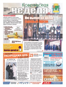 неделя Ковровская Городская информационноаналитическая газета 12+ свежие новости, рассказы о земляках, актуальные темы, культурная и спортивная жизнь, официальная информация, афиша, объявления, сканворд и немного юмора. Читайте в номере: kovrov-gorod.ru РЕКЛАМА Читайте нашу газету на сайте №12 (447) 15 февраля 2019 г. ● ШПОН FINE-LINE ● ПИЛОМАТЕРИАЛЫ (ЭКЗОТИКА) ● НАТУРАЛЬНЫЙ ШПОН ● МЕБЕЛЬНЫЙ ЩИТ ● КЛЕЙ, ГРУНТ, ЛАК ● ТЕРРАСНАЯ ДОСКА Северный проезд, д. 1 Лесоторговая база 2-42-02 2-46-31 8-919-022-02-99 8-919-022-02-88 8-919-022-02-77 8-919-022-02-33 КОМПАНИЯ ВУДСТОК реклама 8 (49232) 3-86-52 8 (904) 260-79-96 ПОВЕРКА СЧЕТЧИКОВ ВОДЫ И ГАЗА ИП Петрова Ю.Г. Аттестат аккредитации № RA.RU.320031 от 28.04.2017 В случае непригодности счетчика оплата за поверку не взимается ВЫБЕРИТЕ УДОБНОЕ ДЛЯ ВАС ВРЕМЯ реклама НА ДОМУ, БЕЗ СНЯТИЯ, БЕЗ НАРУШЕНИЯ ПЛОМБ Работаем с 8.00 до 21.00 без обеда и выходных Уже побывали на многих меховых выставках, но так и не нашли той самой шубы, которую сразу бы захотелось купить? Поверьте, такой проблемы у вас больше не возникнет, если посетите выставку от кировской фабрики «Меха Вятки». Специально для жителей Коврова мы проводим большую финальную в этом сезоне распродажу настоящих русских шуб собственного производства! На ней вы найдете всё, что угодно! Эксклюзивные цвета, которых еще ни у кого нет: лаванда, коньяк, сапфир. Классические темные и популярные светлые цвета: пудра, пастель, жемчуг, графит, уголь. Даже в больших размерах (по 72 включительно)! В наличии! И, конечно же, действуют наши фирменные условия покупки: 1) Шубу можно купить вдвое дешевле! На часть ассортимента действуют скидки до 50%! 2) Любую шубу можно купить в рассрочку БЕЗ ПЕРЕПЛАТЫ на срок до 36 месяцев! Носи сейчас – плати потом! 3) Если у вас уже есть шуба, но она потеряла привлекательность, обменяйте ее с доплатой на новую! Не упустите шанса обновить гардероб выгодно и со вкусом! На распродаже вы найдете коллекцию шуб для всей семьи, включающую в себя изделия из меха норки, мутона, каракуля и песца. Широкий ассортимент представлен моделями классического покроя, которые подойдут женщинам, ценящим традиции, а также современными изысканными решениями, которые подчеркнут образ любой модницы. В наличии – широкий цветовой спектр изделий, полный размерный ряд от 38 до 72 размера. Фабрика «Меха Вятки» делает покупку шубы максимально доступной. Так, например, цена на норковые шубы начинается от 29000 рублей, на добротные мутоновые шубы – от 15000 рублей, на каракуль – от 59000 рублей. Качество шуб? – Шубы отшиваются по ГОСТу из отечественного сырья высшей категории. Шубы сертифицированы, снабжены контрольно-идентификационными знаками (чипами). В 2018 году шубы «Меха Вятки» получили серебряный знак качества «Сто лучших товаров России». Предоставляется гарантия на все изделия. РАСПРОДАЖА ШУБ Дешевле только через год! ВЫРЕЖИ ДАННУЮ СТАТЬЮ – принеси на выставку и получи дополнительную скидку: на норковую шубу – 500 рублей, на мутоновую – 200 рублей. Все подробности вы можете получить на нашем сайте: meha-vyatka.ru или по телефону бесплатной горячей линии – 8-800-222-24-15. реклама ФЕВРАЛЯ, Ковров, ДКиТ «Родина», ул. Волго-Донская, 1 а. С 10 до 19 часов НЕ ПРОПУСТИ! 23 в этом сезоне! последняя страница 3 в киосках «Роспечати» «КОВРОВСКАЯ НЕДЕЛЯ» реклама до 6 человек Сосновая, 19 3-03-75 реклама ÑÀÓÍÀ с 9.00 до 1.00 Слова уважения и благодарности всем, кто встал на пути исламского тер